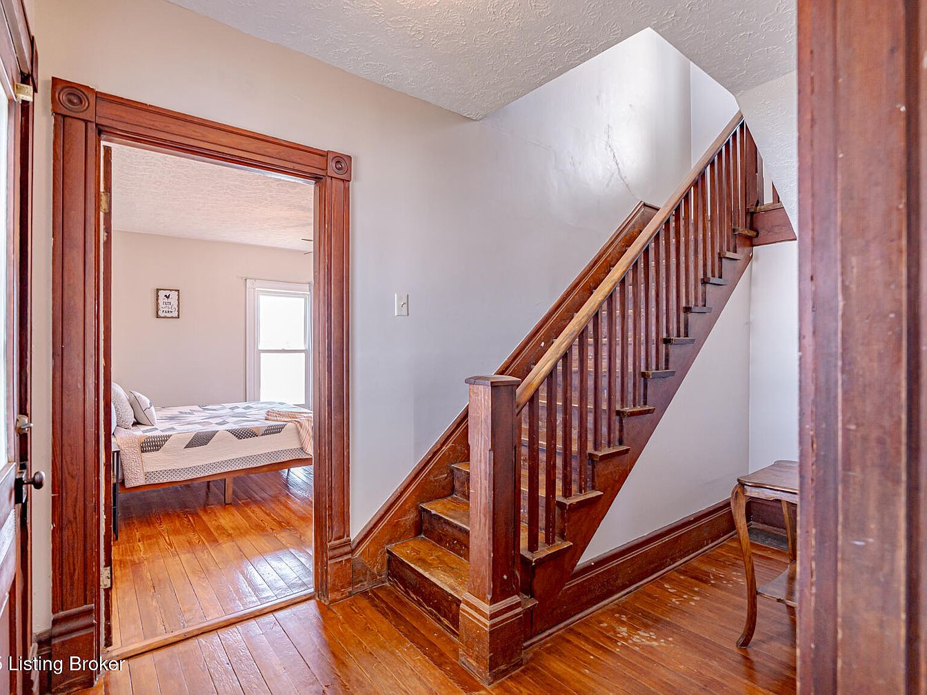 A bright, inviting landing area features polished wooden floors with a warm amber tone, showing some signs of age that add to the historic charm. A classic wooden staircase with sturdy square posts and vertical balusters ascends to the upper level. Beside the stairs, a small vintage side table with curved legs accentuates the traditional aesthetic. Door frames are crafted from rich, dark wood with decorative block corners, highlighting craftsmanship typical of early American homes. A glimpse into an adjacent bedroom reveals a neatly made bed with a patterned quilt, soft neutral wall colors, and abundant natural light from a large window, creating a tranquil and welcoming atmosphere.