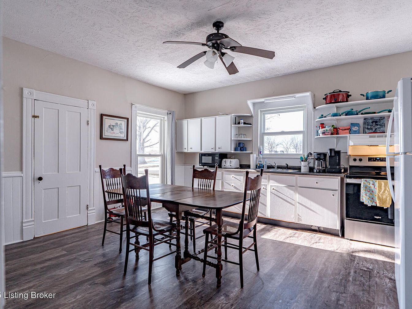 A spacious, sunlit kitchen features rustic wooden flooring and classic white cabinetry. In the center, a wooden dining table with four ornate spindle-back chairs anchors the room. White open shelves and cabinets hold colorful cookware, dishes, and small appliances, creating a lived-in and welcoming vibe. Large windows let in abundant natural light and frame country views. Walls are painted a soft beige, complemented by trim in traditional white. A ceiling fan with light sits overhead. The vintage door and modest artwork add to the cozy, historic charm while modern kitchen essentials—like the stove and refrigerator—blend seamlessly with the classic setting.
