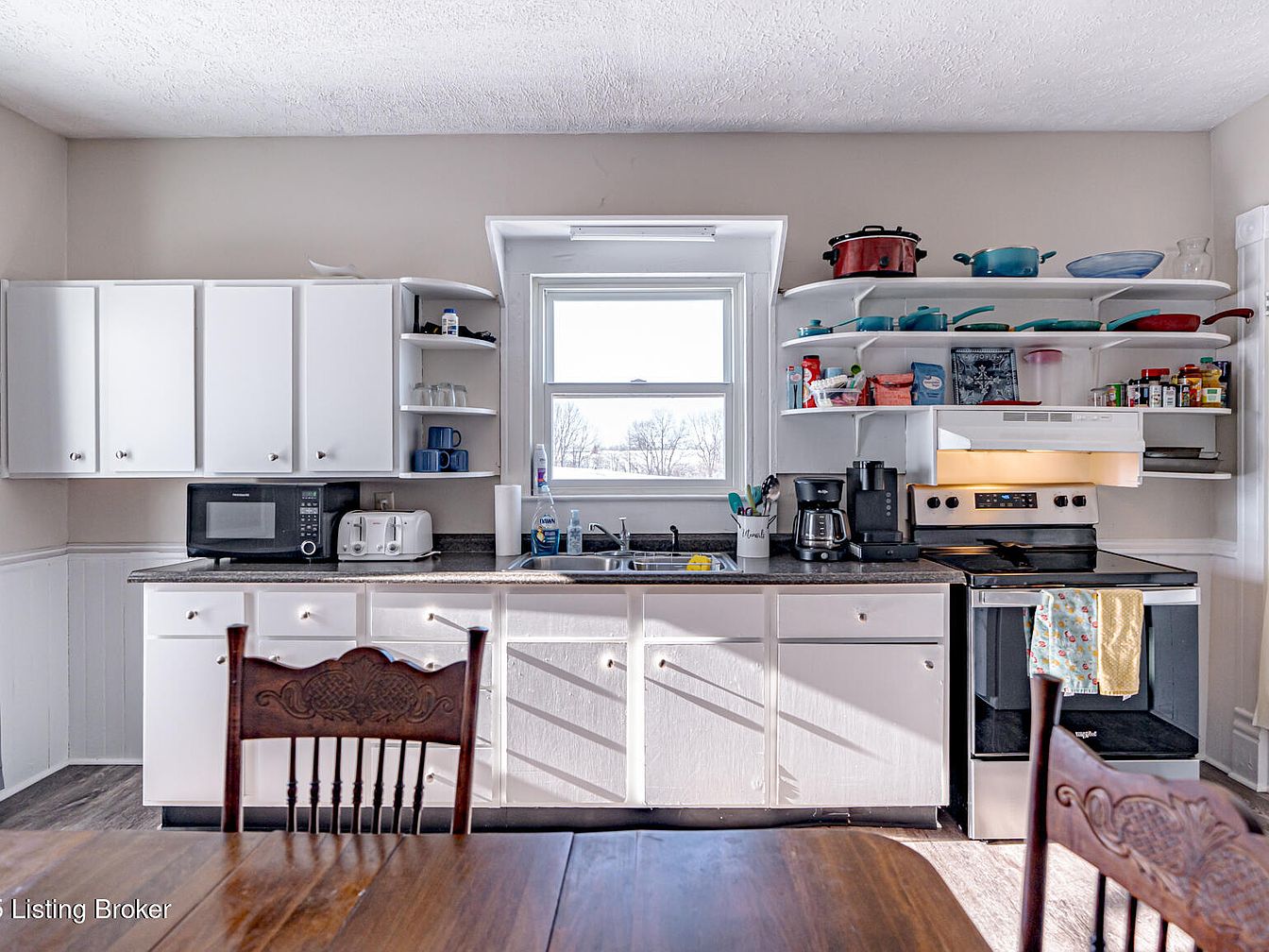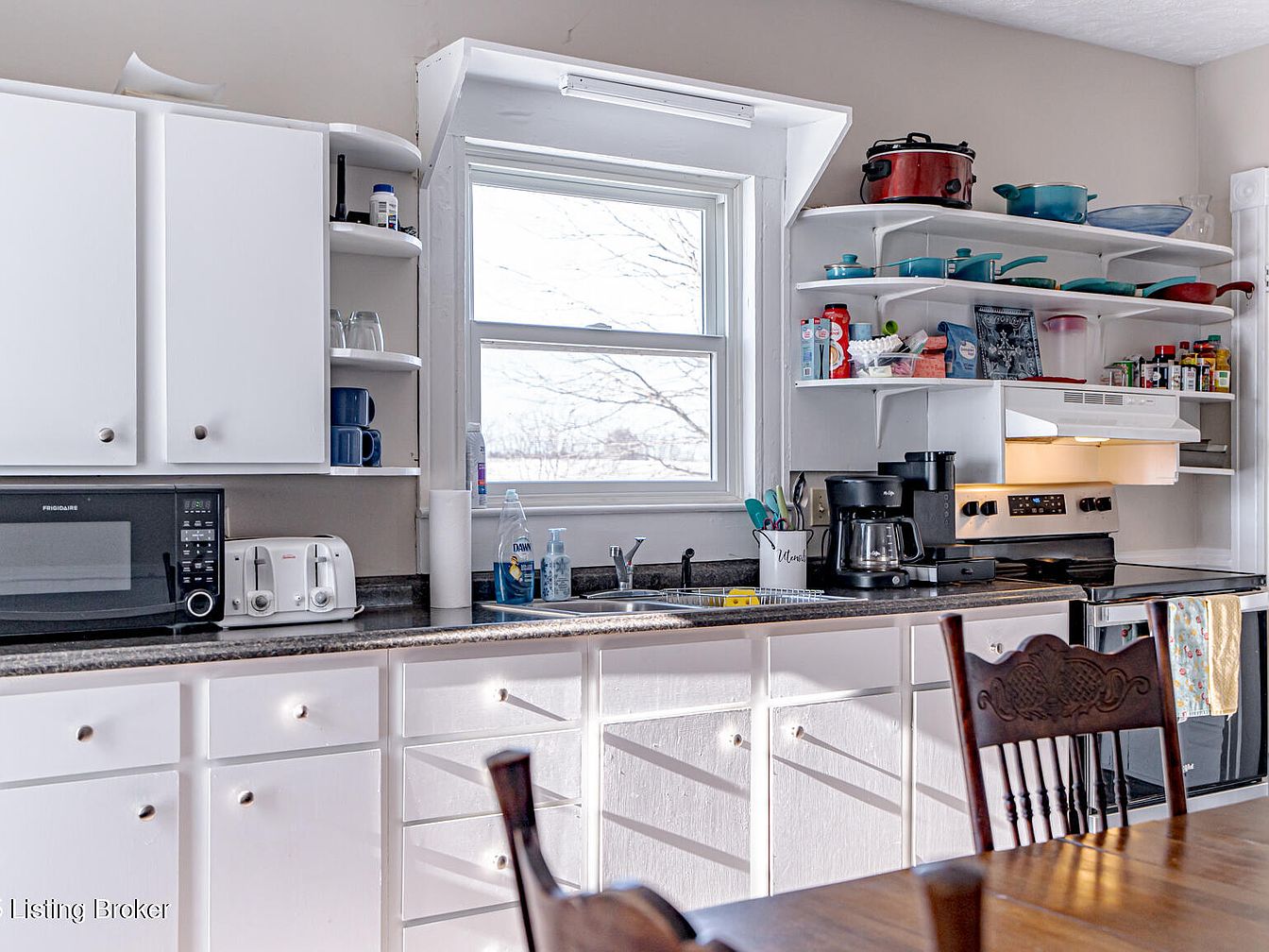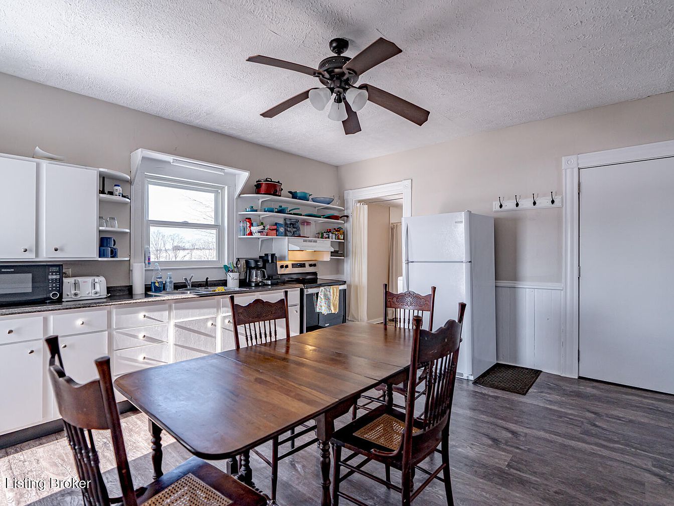 Spacious and bright kitchen with a neutral color palette featuring light grey walls, white cabinetry, and dark countertops. A large window above the sink allows natural light to fill the room, with open shelving displaying cookware and dishes. The kitchen appliances are simple and functional, including a white refrigerator, stove, toaster, and microwave. In the center sits a wooden dining table with four vintage-style chairs, enhancing the room’s historic charm. Dark wood floors add a modern contrast. Subtle architectural details, such as white trim, a ceiling fan, and wainscoting, blend old and new aesthetics for a comfortable, homely atmosphere.