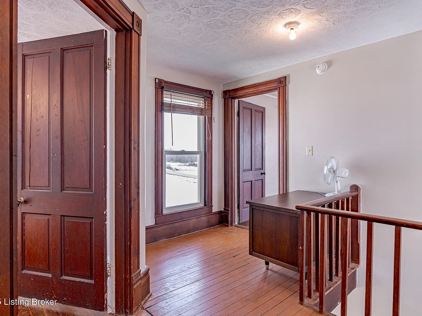 A small, bright upstairs landing area features rich, medium-toned hardwood floors and coordinating wood trim around doorways and windows. Several dark wood paneled doors lead off from the space, their classic style hinting at the historic nature of the home. The pale cream walls complement the warm woodwork and reflect natural light that pours in through a single, large window with wooden blinds. A wooden rail borders a staircase, while a simple desk sits nearby topped with a portable fan. The space is uncluttered, functional, and emphasizes traditional craftsmanship and a minimalist, utilitarian approach.