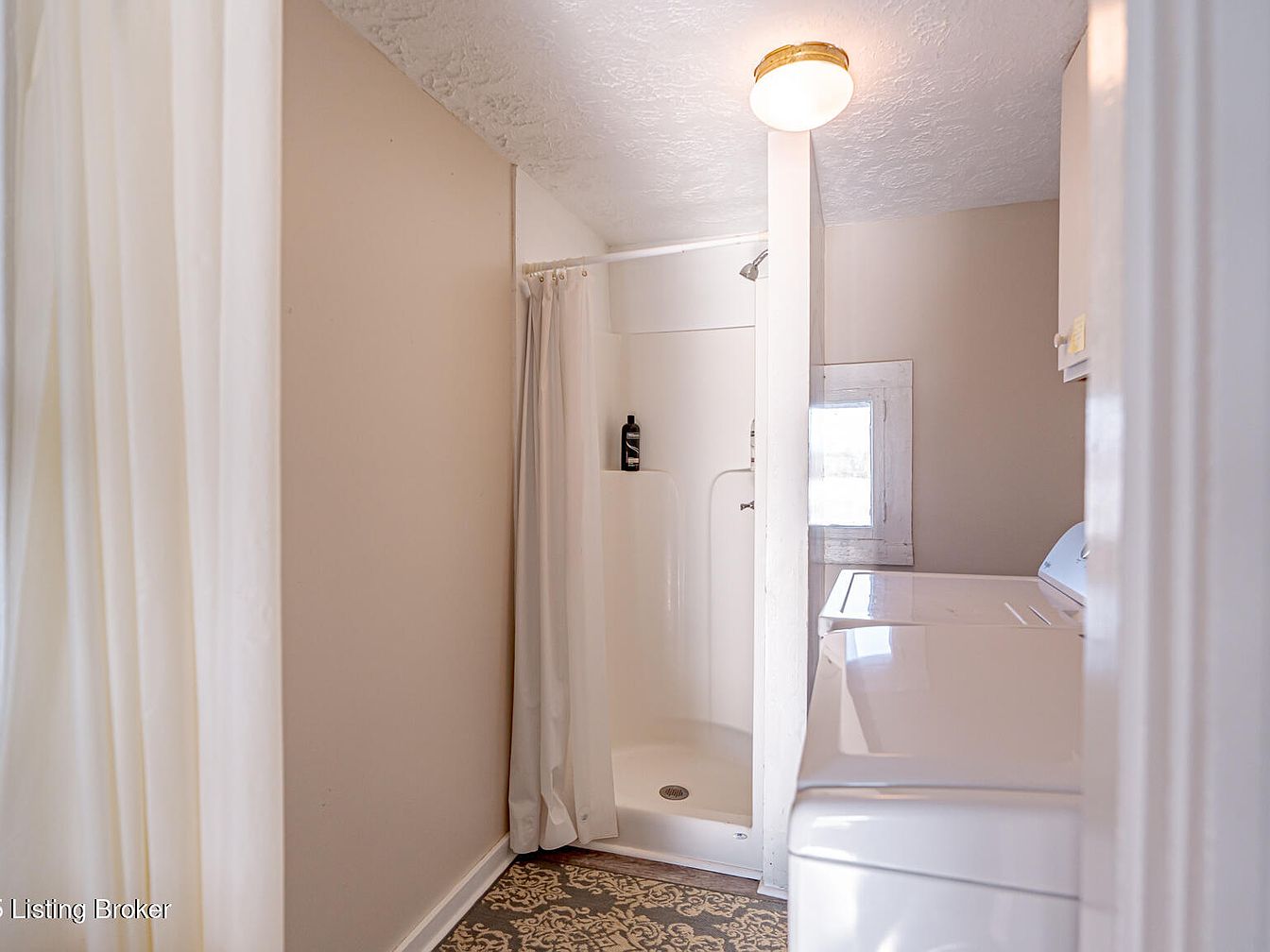 A compact multi-purpose space featuring a white washer and dryer along the right wall and a walk-in shower stall set in the back left corner. The shower has a curtain for privacy and is equipped with a modern fixture and a bottle of shampoo. Neutral beige walls, white trim, and a patterned tile floor create a simple, clean look. A single white pillar separates the shower area from the laundry. The ceiling is textured and fitted with a round, brass-trimmed light fixture, while a small window framed in white brings natural light into the room.