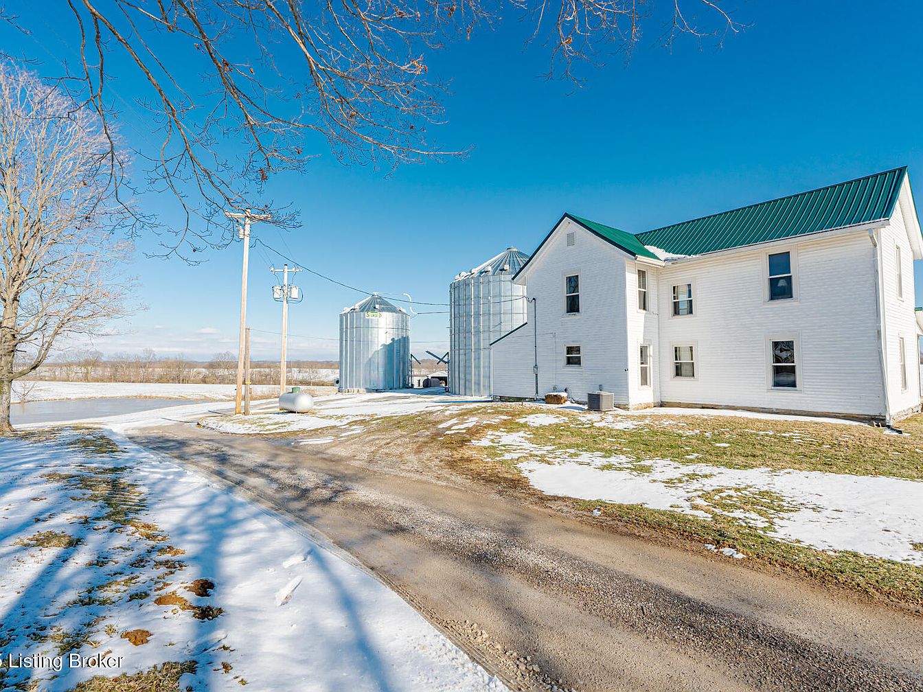 A broad view of a classic white two-story farmhouse with a green metal roof, standing in a partially snow-covered rural landscape under a clear bright blue sky. The house features a simple, rectangular design with several double-hung windows evenly spaced on both floors. To the side of the home, large silver grain silos suggest the working agricultural nature of the property. A dirt and gravel driveway curves past the house, bordered by thin patches of snow and some exposed grass. Bare tree branches frame the scene, and the open fields in the background reinforce the tranquil, rural setting.
