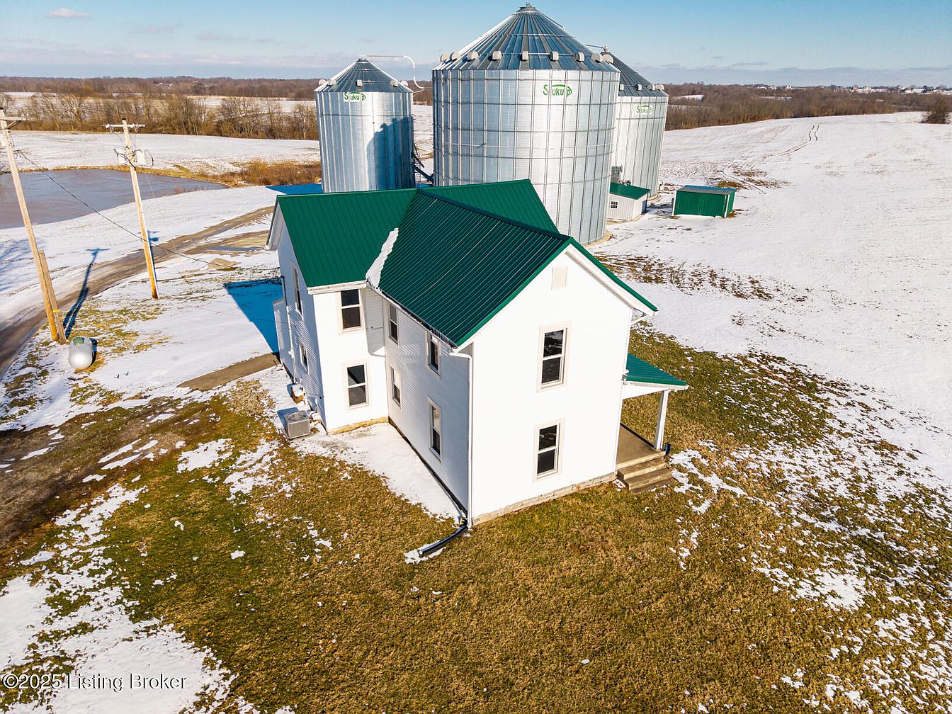 A two-story white farmhouse sits on gently rolling land partly covered with snow, reflecting a classic rural aesthetic. The house features a green metal roof with multiple slopes, prominent against the bright winter landscape. A small covered front porch with simple steps leads to the entrance. Large windows line the exterior, allowing natural light to flood the interior. In the background, massive cylindrical grain silos and a green-roofed outbuilding indicate a working farm setting. Utility poles and a propane tank line the driveway, with broad, open fields stretching toward the horizon under a clear blue sky.