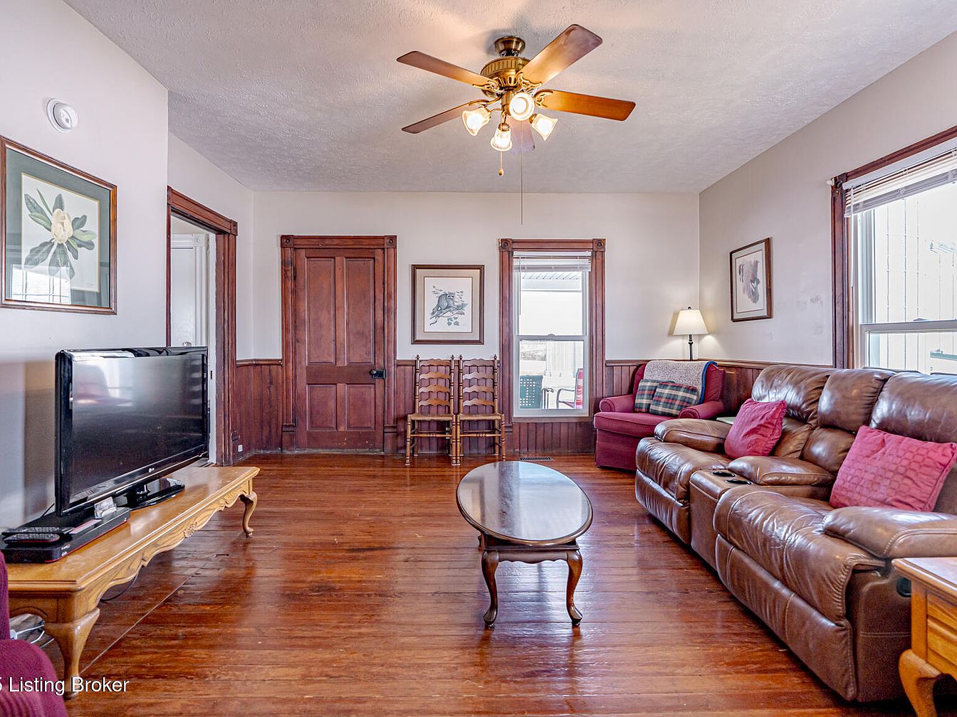 Spacious living room with warm, wooden flooring and rich, medium-toned wood trim on doors, window frames, and wainscoting. A brown leather sectional sofa lines one wall, adorned with textured red and plaid throw pillows. To the side, a red high-back armchair sits under a standing lamp. The room features a traditional wooden coffee table and a long, carved TV stand supporting a flat-screen television. Large windows bring in natural light, while botanical and animal-themed artwork decorates the soft beige walls. A ceiling fan with four lights provides a classic touch to the otherwise cozy and inviting setting.