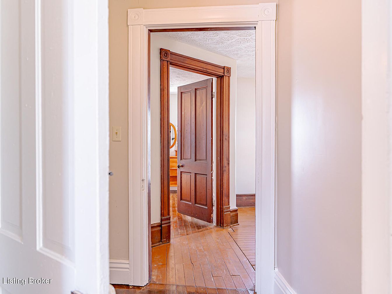 A long, narrow hallway leads to a bedroom, featuring traditional wooden doorways with ornate trim and a warm, honey-colored hardwood floor that reflects soft daylight. Walls are painted in a gentle cream, contrasting with the rich wood grain of the doors and frames. The hallway bends slightly, drawing the eye to a partially open door, revealing more of the period woodwork and a glimpse of another sunlit room beyond. Details such as the baseboards and decorative rosettes on the doorway corners enhance the historic character, while the overall color palette creates an inviting, serene transition between spaces.