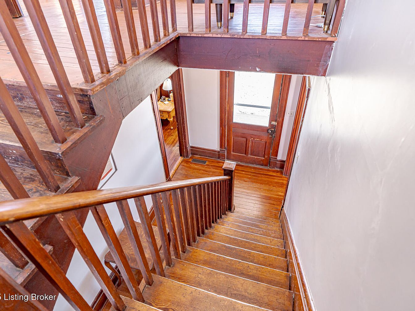 A wooden staircase descends to a landing that leads directly to a door with a large window, allowing natural light to pour in. The banister and railings are made from dark, polished wood, which contrasts with the lighter wood of the steps and floor. The stairway turns at a landing, revealing functional architectural detailing typical of historic homes. Off to the side, a doorway opens into what appears to be another room, partially visible with wooden floors and a small table and lamp. The walls are painted a pale, neutral color, complementing the home’s cozy, warm atmosphere.