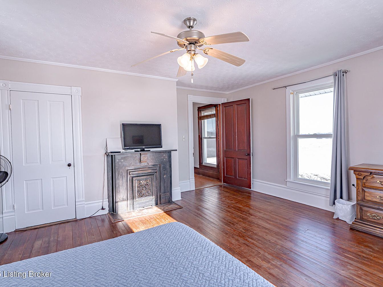 A spacious bedroom features warm, polished hardwood floors and soft beige walls with crisp white trim. A classic ceiling fan with light fixture hangs from a textured white ceiling, providing both illumination and comfort. One wall has a decorative black fireplace, topped with a small flat-screen TV. The doors vary in color: one is a bright white paneled door, while another is a rich wooden hue, adding contrast. Large windows let in abundant natural light, framed by simple gray curtains. A wooden nightstand with ornate detailing sits next to the window, highlighting the room’s blend of traditional and functional aesthetics.