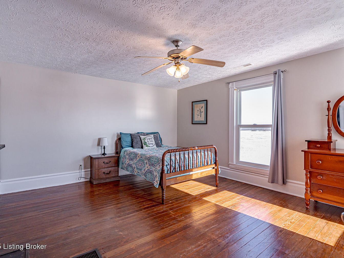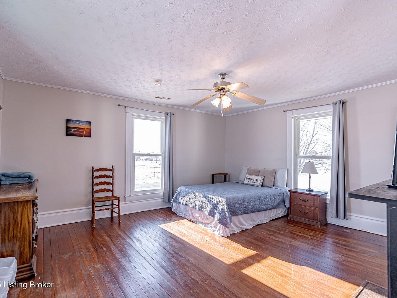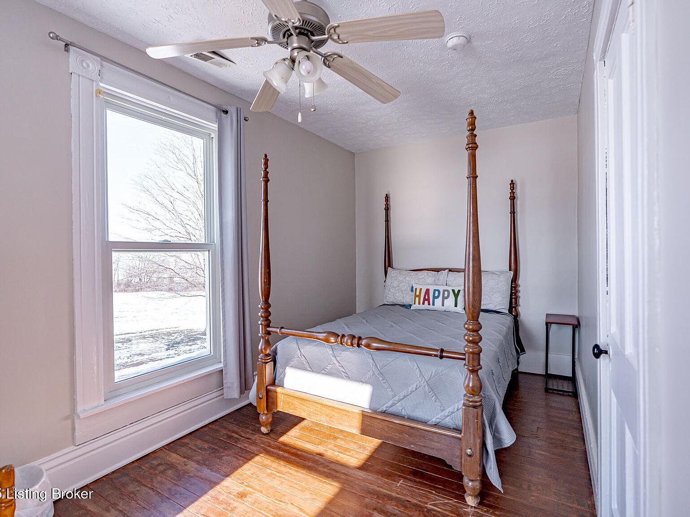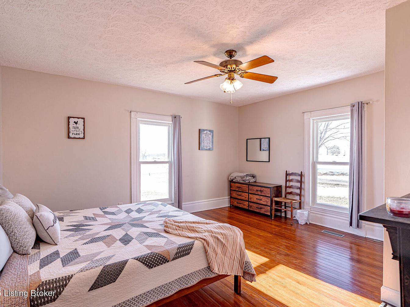 A spacious bedroom features two large windows framed in white, allowing ample natural light to fill the space and offer views of the outdoors. The walls are painted a soft beige, complementing the rich honey-toned hardwood floors. A bed with a cozy geometric-patterned quilt and several pillows takes center stage. Against the far wall, a rustic wooden dresser and simple wooden chair add a touch of country charm. The ceiling is textured and features a brass ceiling fan with wooden blades and a light fixture, while modest framed art and a mirror adorn the walls for a warm, welcoming ambiance.