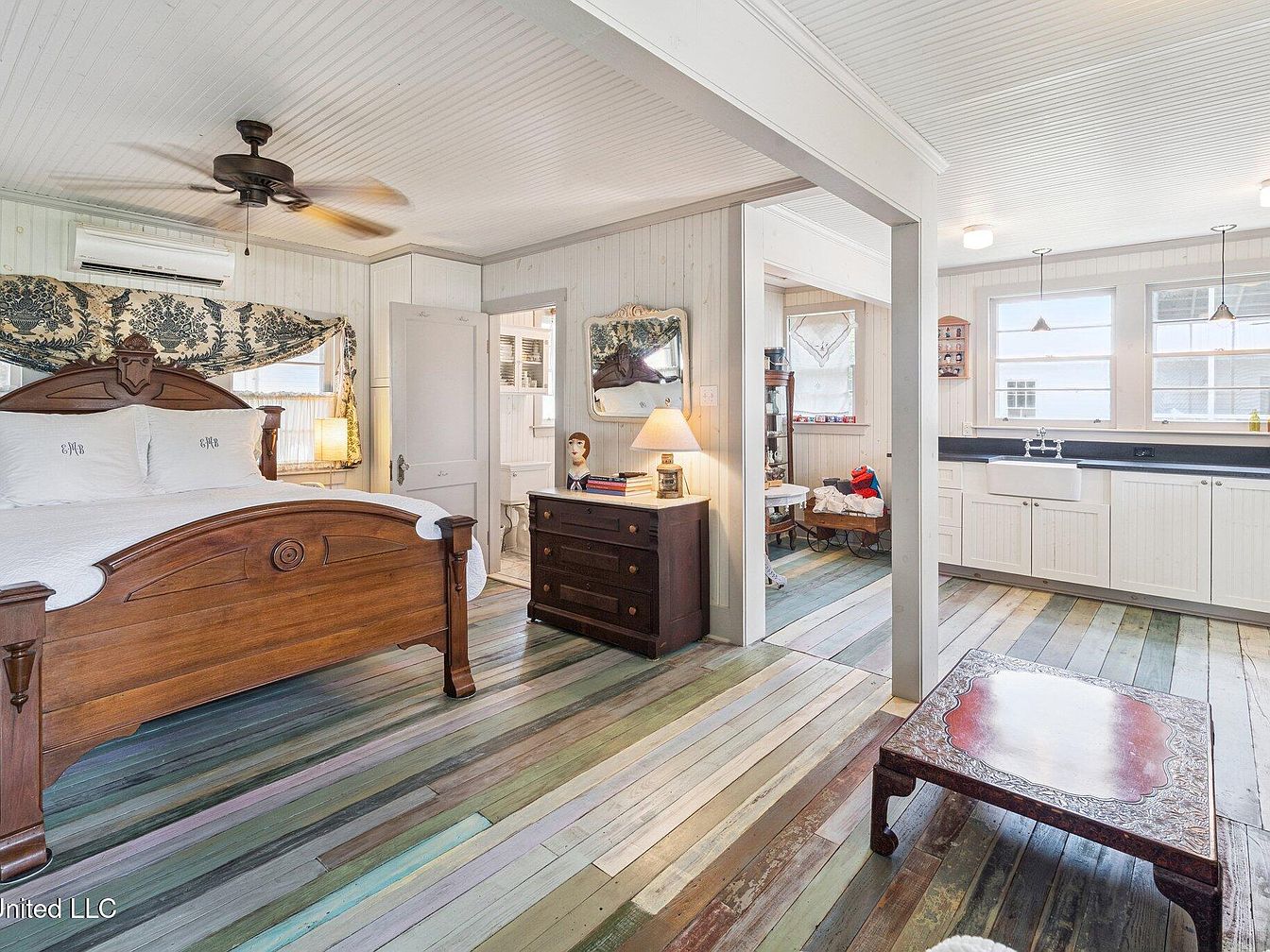 This bedroom features warm, dark wood furniture, including a carved bed and a matching dresser, harmonizing with the unique, multi-colored wooden flooring. The walls are dressed in light-colored tongue-and-groove paneling, complementing the vintage aesthetic. A traditional ceiling fan circulates air, while a patterned window treatment adds a touch of elegance. Natural light streams in through large windows, illuminating a rustic, simple nightstand with a lamp. Partially visible through an open doorway is a quaint bathroom area with farmhouse-style cabinetry and contrasting black countertops. The overall atmosphere is cozy and inviting, blending historical charm with modern comfort.