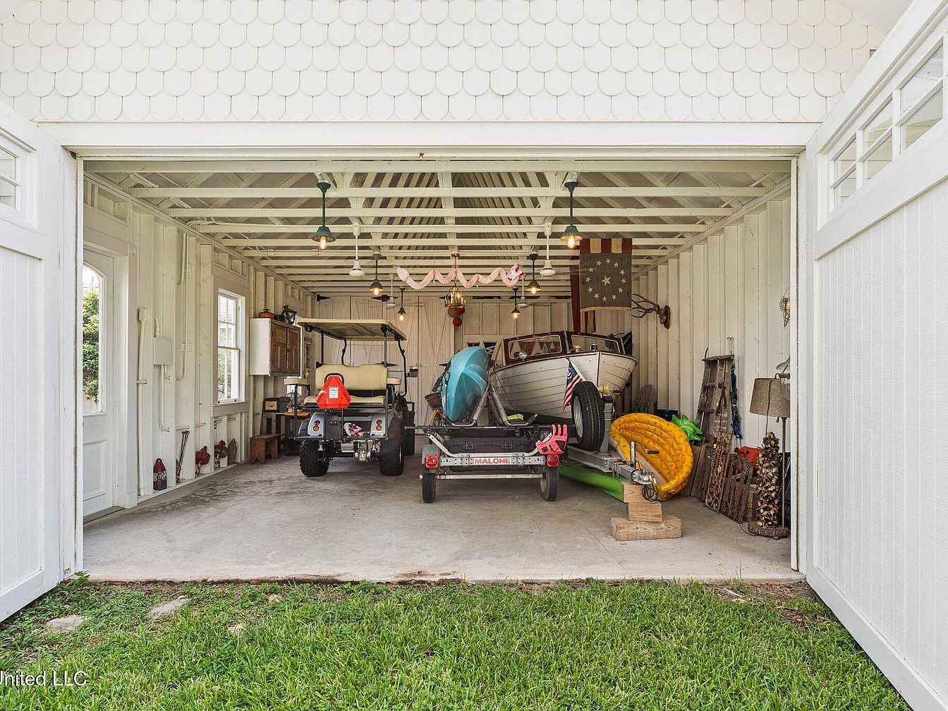 A spacious garage showcasing a boat and a golf cart parked inside, complemented by vibrant colors and practical design. The white scalloped siding enhances a classic Americana style, while the exposed wooden beams provide a rustic touch. Vintage lamps hang from the ceiling, casting warm light over the well-organized tools and decorations on the walls, including a flag with stars and stripes. Various watercraft and recreational items add a playful element to the environment, surrounded by a neatly kept grass area just outside the open door. The space combines functionality with nostalgic charm.