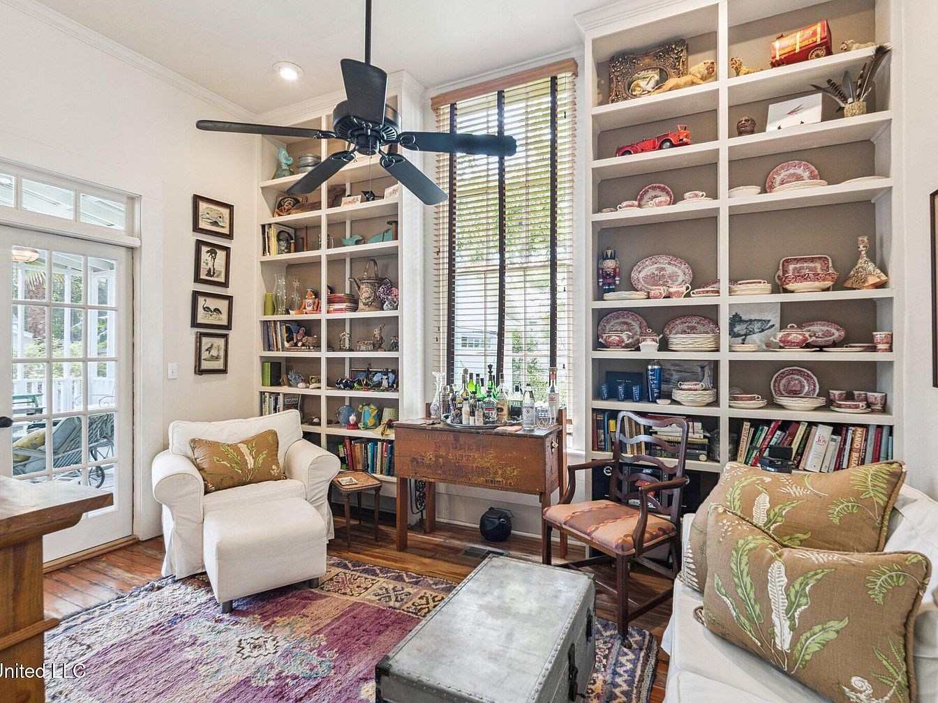 This cozy living room features rich hardwood flooring that adds warmth and character. A plush white armchair is adorned with decorative pillows displaying botanical patterns, inviting relaxation. A prominent bookshelf occupies one wall, showcasing an eclectic collection of dishes, books, and curiosities, all framed by soft, neutral tones that create a timeless ambiance. Sunlight filters through wooden blinds, enhancing the natural light. A rustic coffee table with a metallic finish adds texture, while framed artwork adorns the walls, contributing to a personal and homely feel. The ceiling fan provides a functional yet stylish touch, harmonizing the space.