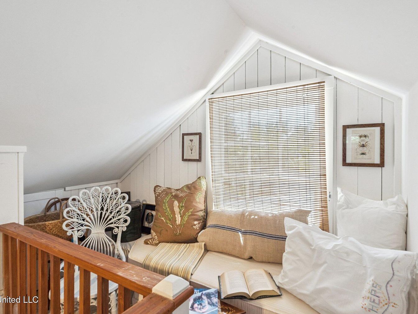 This cozy loft nook features a sloped ceiling, enhancing the room’s intimate atmosphere. The walls are clad in white tongue-and-groove paneling, complementing the natural light that filters through the bamboo blinds. A plush bench, adorned with an assortment of pillows in earthy tones, invites relaxation, while a whimsical wrought-iron chair adds a touch of vintage charm. Decorative wall art, including framed botanical prints, contributes to the cozy decor. A wooden railing offers safety and a subtle separation from the staircase area, maintaining an open feel while providing character to the space.