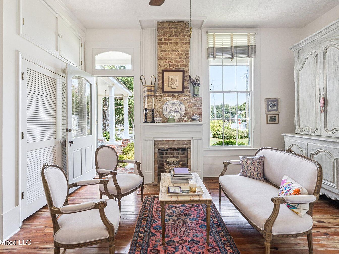 This living room features a cozy and inviting design with a warm color palette. The main focal point is a classic brick fireplace, framed by white trim, providing a rustic contrast. Light wooden floors extend throughout, enhancing the airy ambiance. Furniture includes elegant, cream-colored seating with intricate wooden details, complemented by a decorative, vintage-style area rug. A glass-top coffee table holds various books, offering a literary touch. Large windows allow natural light to flood the space, while sheer drapes add softness. Decorative art pieces hang on the walls, enhancing the room’s charm and character.