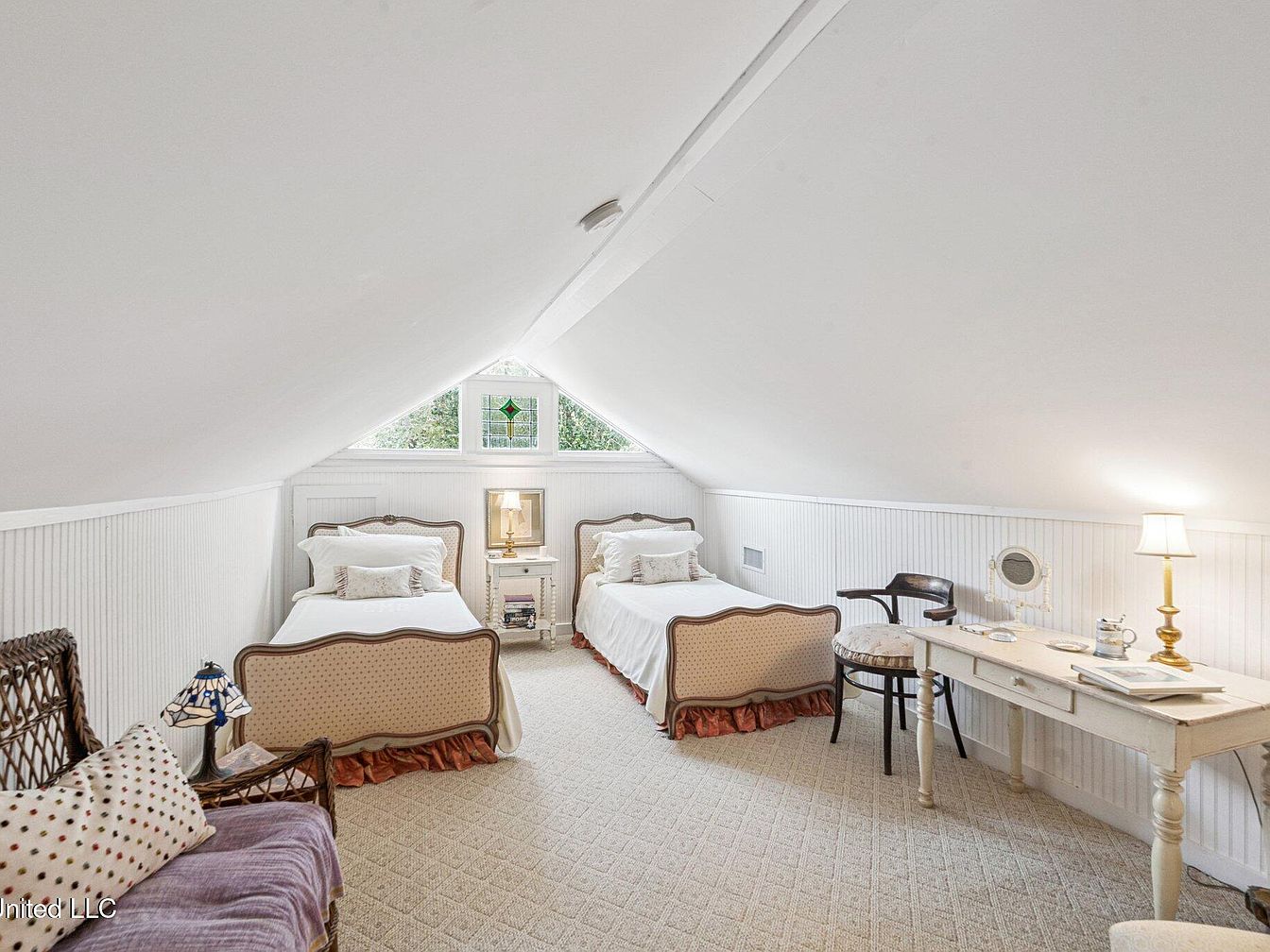 This cozy guest bedroom features two twin beds, each adorned with elegant headboards and soft, inviting bedding. The walls are painted white and accented with beadboard, enhancing the room’s airy feel. Natural light spills in through a charming stained-glass window, casting colorful patterns on the floor. A small vintage table and an antique chair add character, while a softly glowing lamp provides warmth. A wicker chair draped with a cozy blanket invites relaxation. The carpet, with a delicate pattern, complements the room’s pastel tones, creating a serene and welcoming atmosphere ideal for guests.