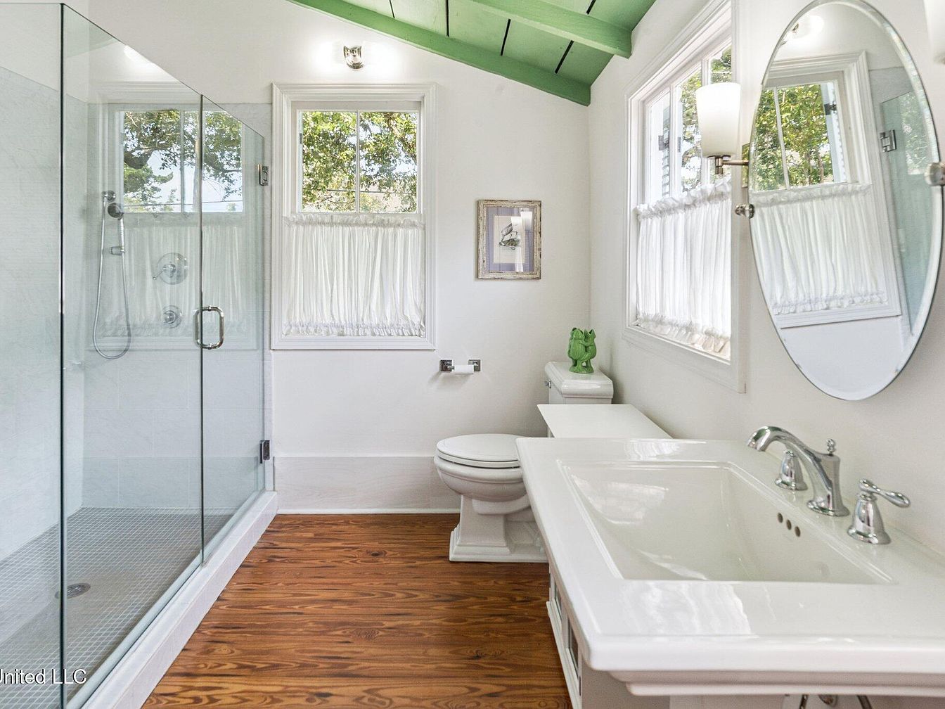 This bathroom features a clean, modern layout with a combination of rustic and contemporary elements. A spacious glass shower occupies one corner, revealing a tiled floor. Bright white walls enhance the natural light streaming through large windows, adorned with delicate sheer curtains. The ceiling displays a striking green color, adding a playful contrast to the otherwise neutral palette. A white vanity with a deep sink and polished chrome fixtures stands out against the warm, honey-toned wooden floor. A small green frog statue and a framed artwork offer charming decorative details, bringing a touch of personality to the space.