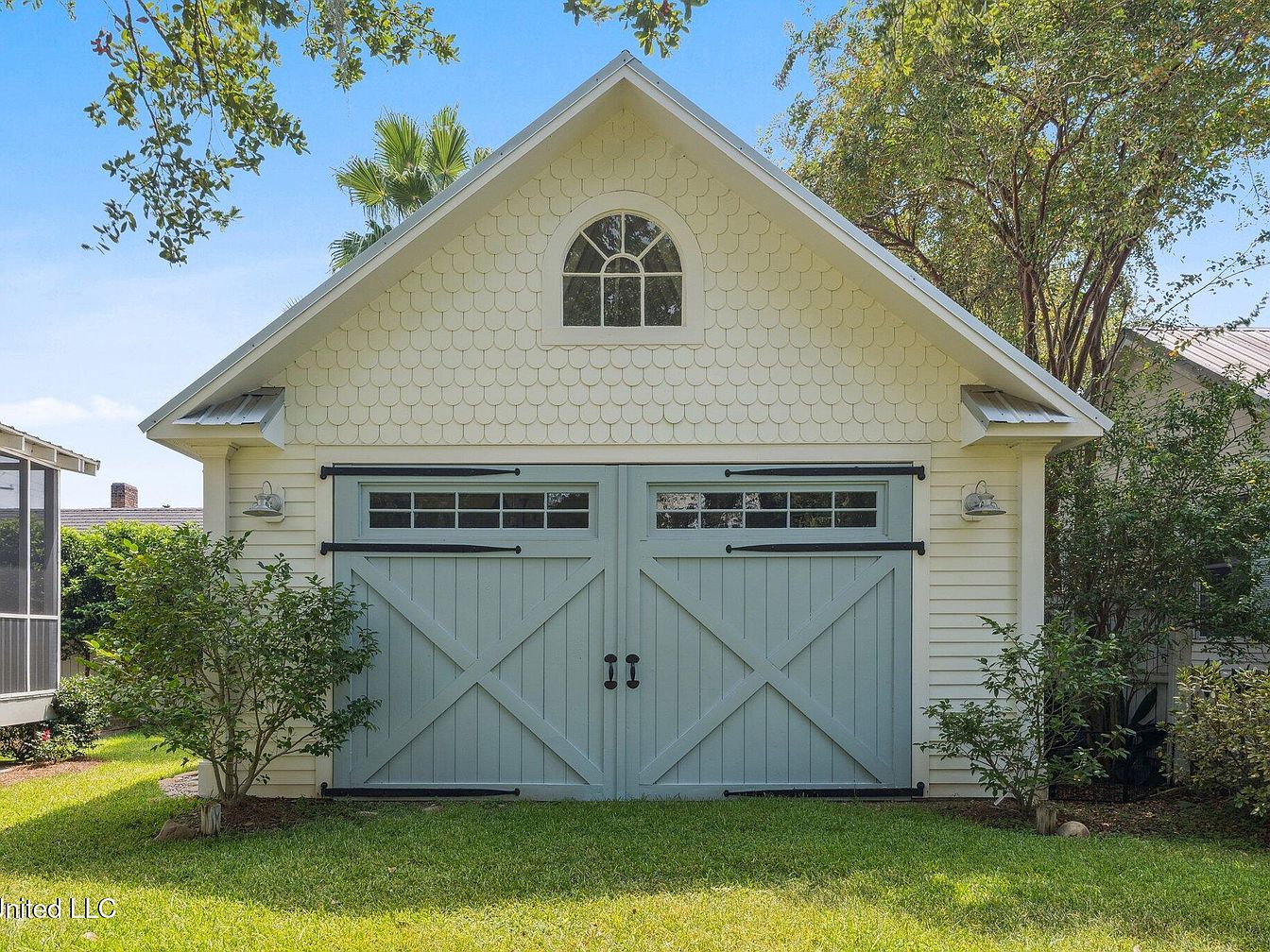 The image shows a charming garage with a distinct architectural style. Its gable roof is adorned with decorative shingles, lending a classic touch. The light blue double doors, featuring diagonal braces, are accentuated by black sliding hardware and sophisticated handles, providing a rustic yet elegant ambiance. Above the doors, a round window allows natural light to filter in, enhancing the inviting feel. Surrounding the garage, lush greenery and well-manicured shrubs add a refreshing contrast against the pale siding. The spacious lawn further enhances the exterior, creating a picturesque and welcoming entrance to this historic home.