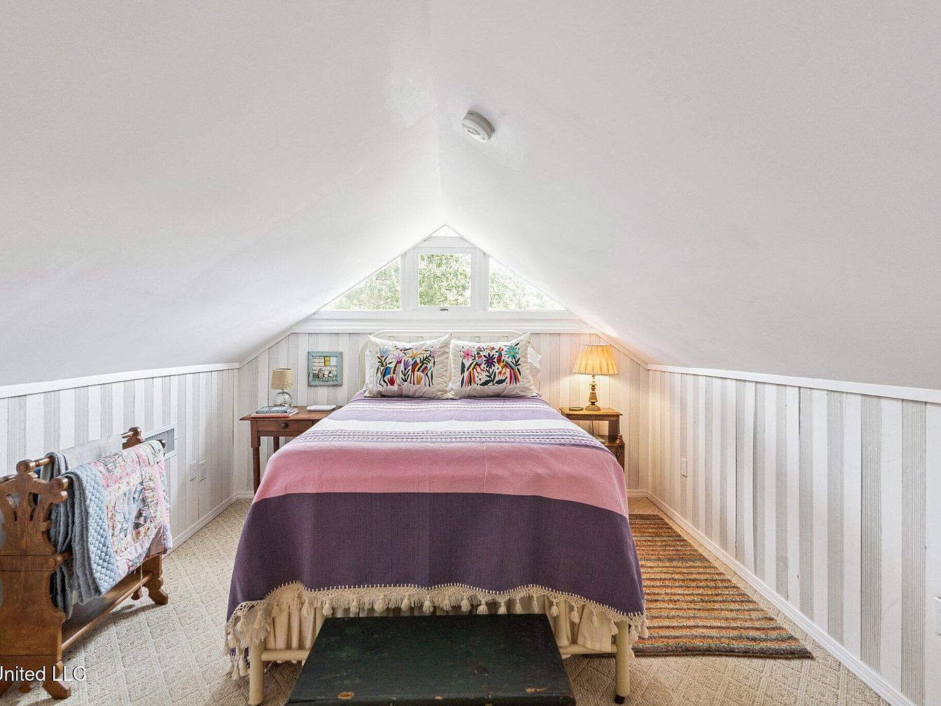This cozy attic bedroom features a sloped ceiling, enhancing its intimate feel. The walls are adorned with white vertical paneling, paired with a soft beige carpet that adds warmth. A double bed with vibrant bedding in muted pink and purple tones is centered, flanked by a small nightstand with a lamp casting a gentle glow. Colorful, patterned throw pillows elevate the visual interest. To the left, an antique wooden stand displays a quilt and complements the rustic charm. Natural light enters through large windows, offering a picturesque view, while a striped rug grounds the space, adding texture and comfort.