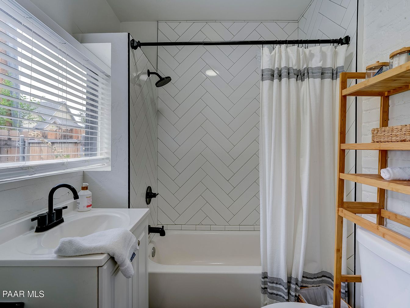 A bright and airy bathroom featuring a classic white bathtub set against a wall of white subway tiles arranged in a refined herringbone pattern. Matte black fixtures—faucet, showerhead, and curtain rod—add striking contrast to the overall light color scheme. Natural light floods the space through a wide window with white horizontal blinds, illuminating the crisp white vanity topped with a matching sink. To the right, a tall wooden shelving unit offers open storage, displaying neatly rolled towels and baskets, contributing to a minimalist and organized feel. Soft textures and clean lines evoke a serene, contemporary atmosphere.