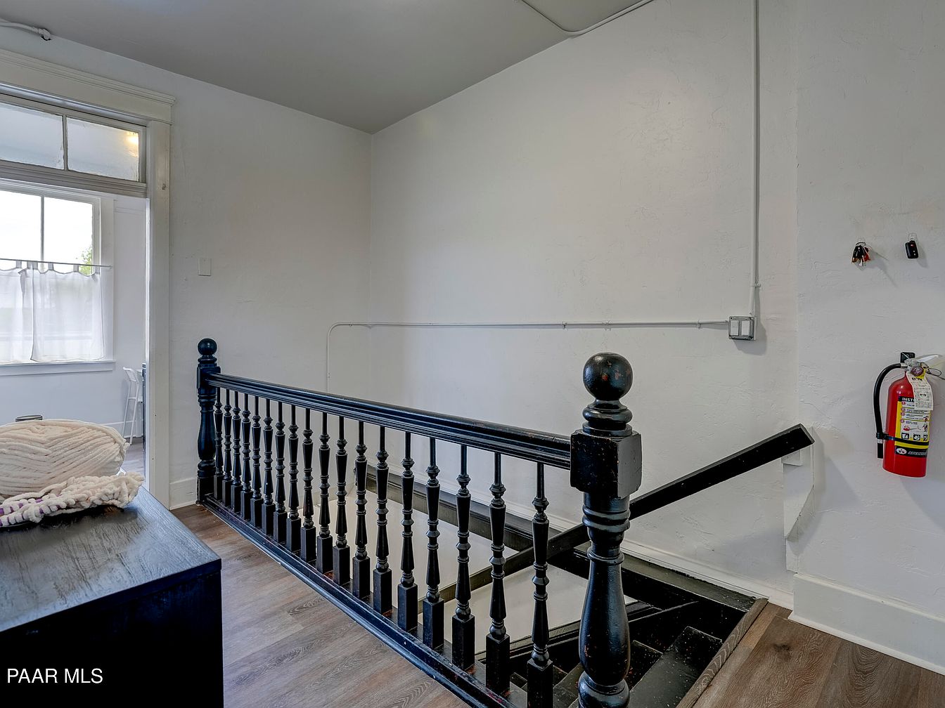 A small stairway landing features a dark, classic wooden banister with turned spindles and glossy newel posts, contrasting against crisp white walls and ceiling. The landing is illuminated by natural light from a tall window dressed with a short, simple white curtain. The floor is covered in medium-toned wood laminate, lending warmth to the space. To the right side, a bright red fire extinguisher is mounted on the wall, along with some exposed utility wiring, adding to the historic, utilitarian vibe. Nearby, a dresser with a folded cream blanket sits beside the stairwell entrance, hinting at a blend of cozy and practical use.