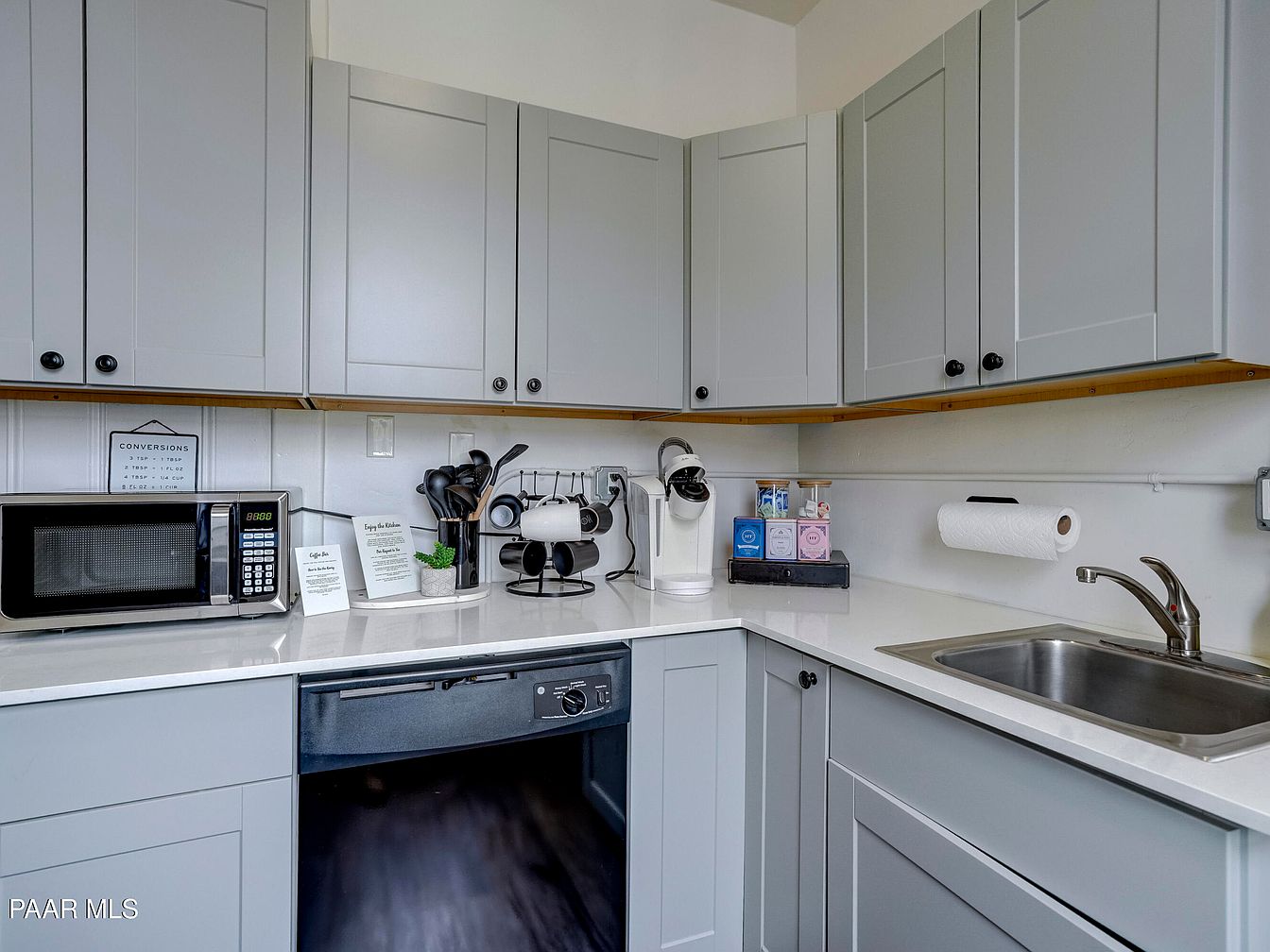 A corner section of the kitchen highlights sleek, light gray shaker-style cabinets with matte black knobs, offering a contemporary and clean aesthetic. The white quartz countertop provides a bright, modern surface, while a stainless steel sink with a curved faucet occupies one side. Small appliances, including a black microwave, a black dishwasher, and a white Keurig coffee maker, rest on the counters. Above the counter, the cabinetry continues around the corner, maximizing storage. Accessories such as a mug tree, utensil holder, tea and coffee pods, a paper towel holder, and kitchen conversion chart add both utility and a friendly, welcoming ambiance.