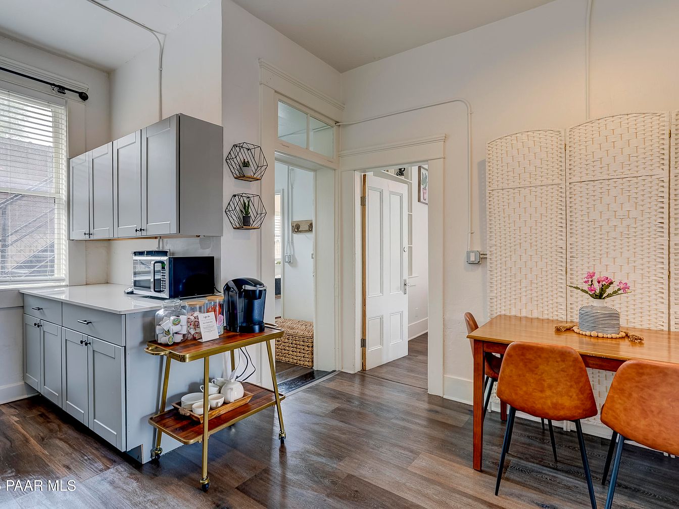 A cozy kitchen and dining nook featuring a blend of modern and vintage styles. The left side presents soft gray cabinets with sleek lines, a white countertop beneath a wide window with horizontal blinds, and small appliances like a microwave and coffee maker. A stylish bar cart holds coffee mugs, jars, and supplies, merging functionality with charm. On the right, a wooden dining table is paired with mid-century inspired caramel-colored chairs, all set in front of a white woven folding screen for texture and privacy. The table is accented by a striped planter with pink flowers. The room is bright, with white walls and dark wood floors.