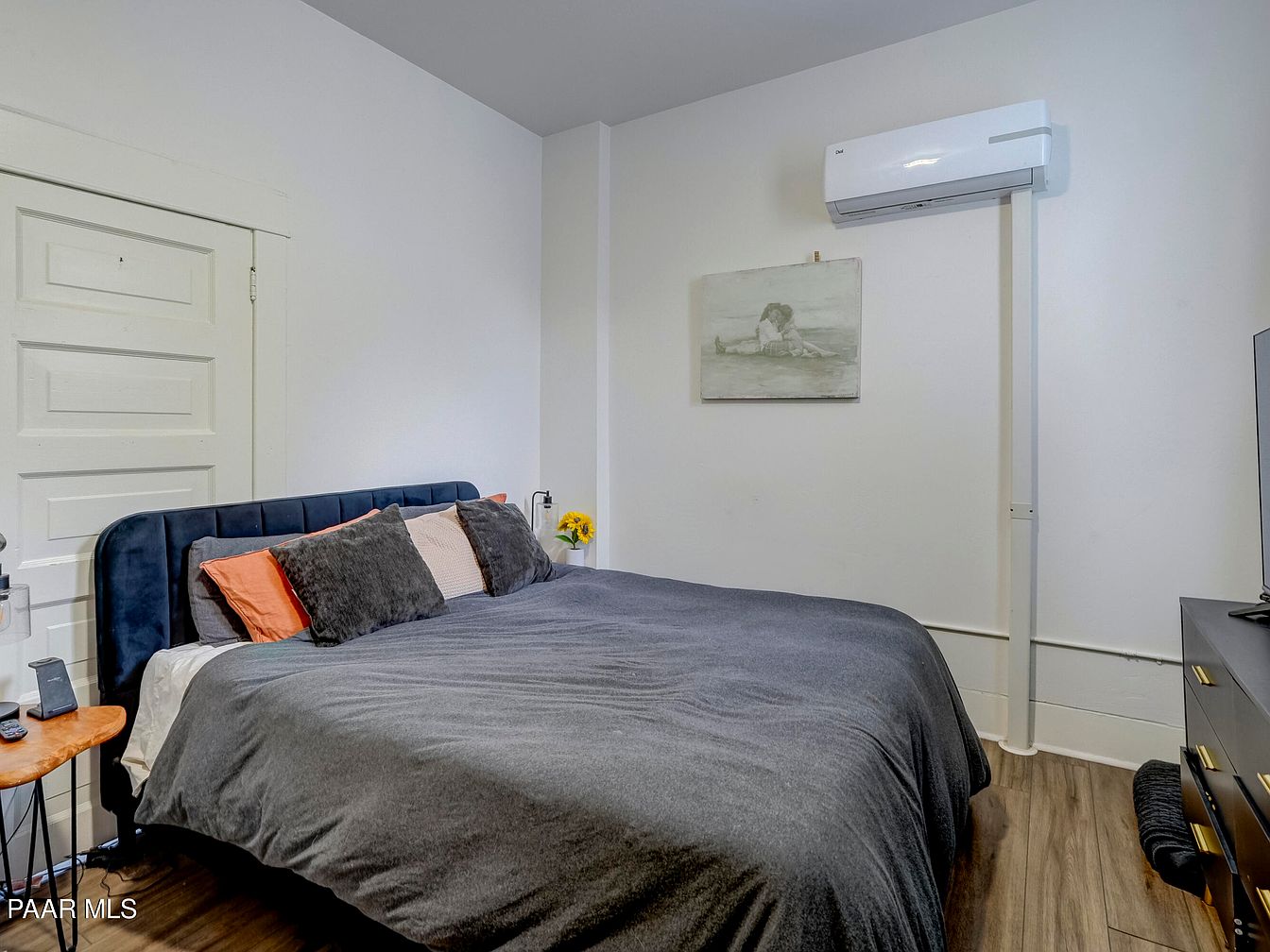 A cozy bedroom corner featuring a deep blue upholstered bed with layered pillows in shades of orange, cream, and charcoal, and a charcoal comforter. The bed is positioned against a plain white wall with a minimalist painting of a reclining figure hanging above. An air conditioning unit sits high on the wall, emphasizing comfort. The furnishings are simple, with a small wooden side table and a modern black dresser with gold handles. The space is adorned with a few subtle decorative touches, such as a small glass vase with yellow flowers. Wood-look flooring adds warmth to the otherwise cool-tone room.