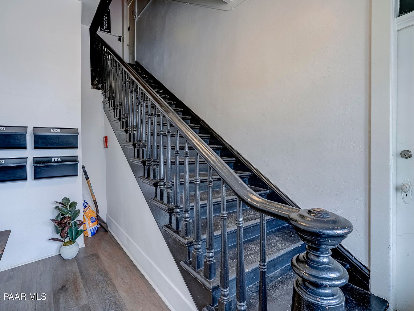 A classic wooden staircase with glossy, dark-painted handrails and balusters ascends along one wall, creating a striking feature in a narrow entryway. The walls are painted a clean, bright white, highlighting the bold contrast of the black staircase. On the left side, four black mailboxes are mounted neatly, adding functionality to the hall. A potted plant introduces a touch of greenery, while a small corner houses some practical items like cleaning supplies. The space is finished with medium-tone wood flooring, lending warmth to the otherwise monochromatic color palette and evoking a sense of historical charm with modern utility.