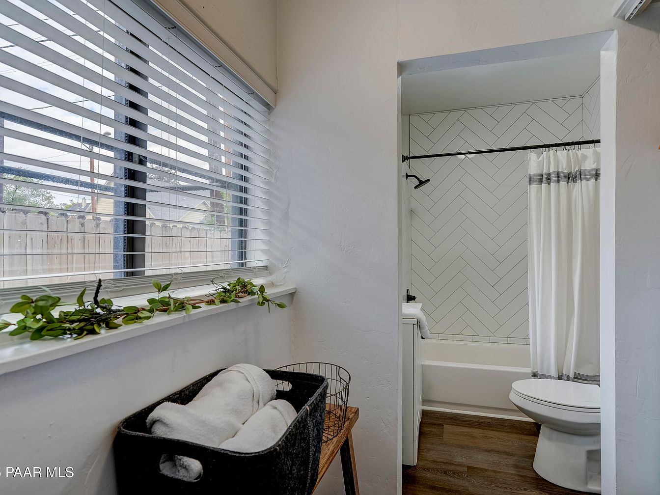 A cozy bathroom scene with a modern yet inviting feel. The flooring is a warm-toned wood, providing a soft contrast to the crisp white walls. A large window with white blinds allows natural light to pour in, brightening the space. A long windowsill features a leafy green garland for a fresh touch. Next to the window, a black wire basket holds neatly rolled white towels atop a narrow bench. The entrance to the bathroom reveals a clean bathtub/shower combination, accented with a white curtain and striking herringbone-patterned white tile. Minimalist fixtures in matte black add a contemporary flair.