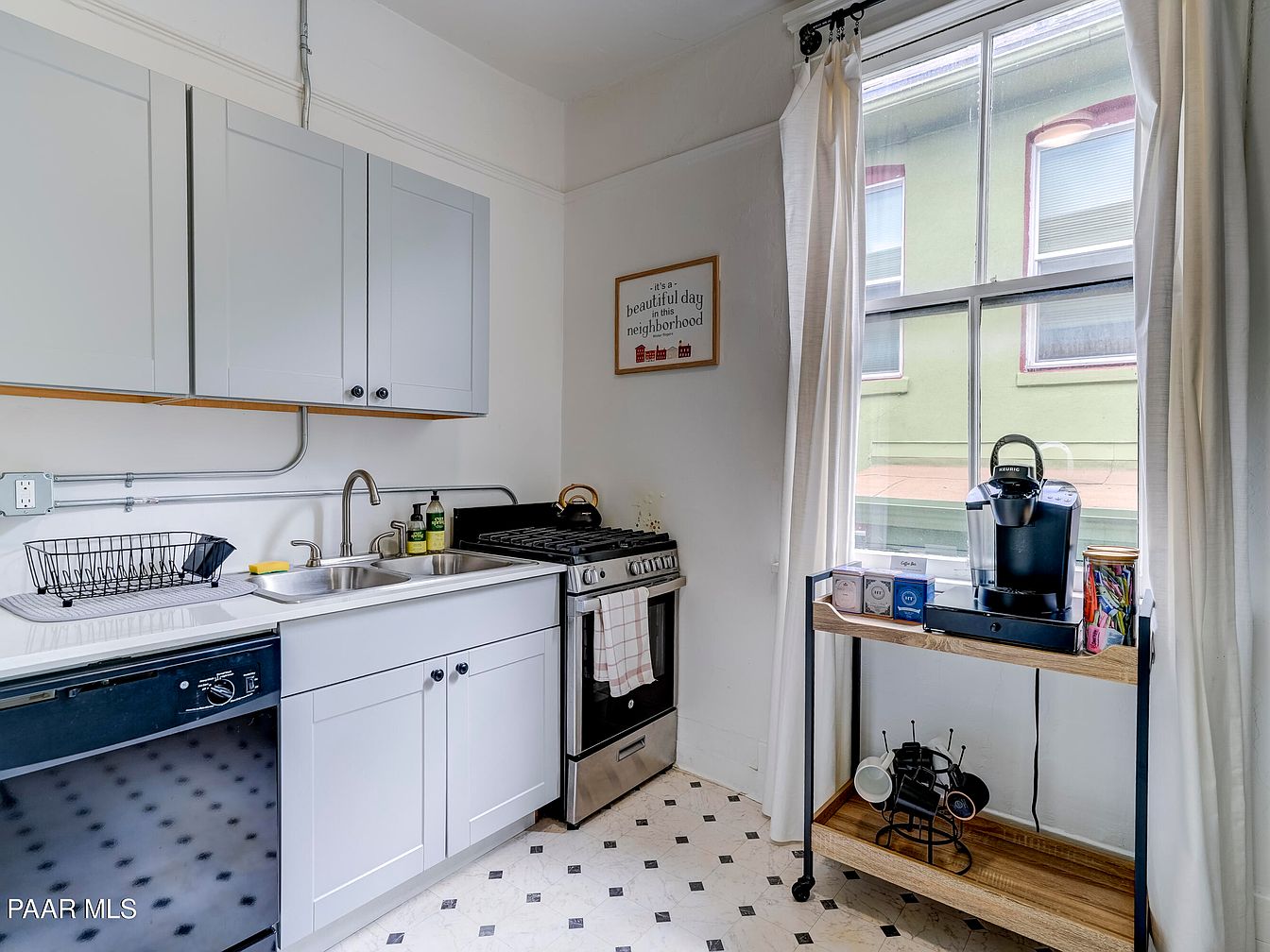 Compact and bright, this kitchen space features light grey cabinetry with simple black knobs and a double stainless steel sink set into a white countertop. A modern black dishwasher and a sleek stainless steel gas stove provide functional cooking elements. Shelves above the sink and stove maximize storage, while the neutral palette of whites and greys gives a clean, airy feel. A large, sunlit window with sheer white curtains illuminates the room, and below it stands a wooden and black metal cart holding a coffee maker, mugs, and coffee supplies. Soft patterned linoleum flooring adds vintage charm to the functional atmosphere.