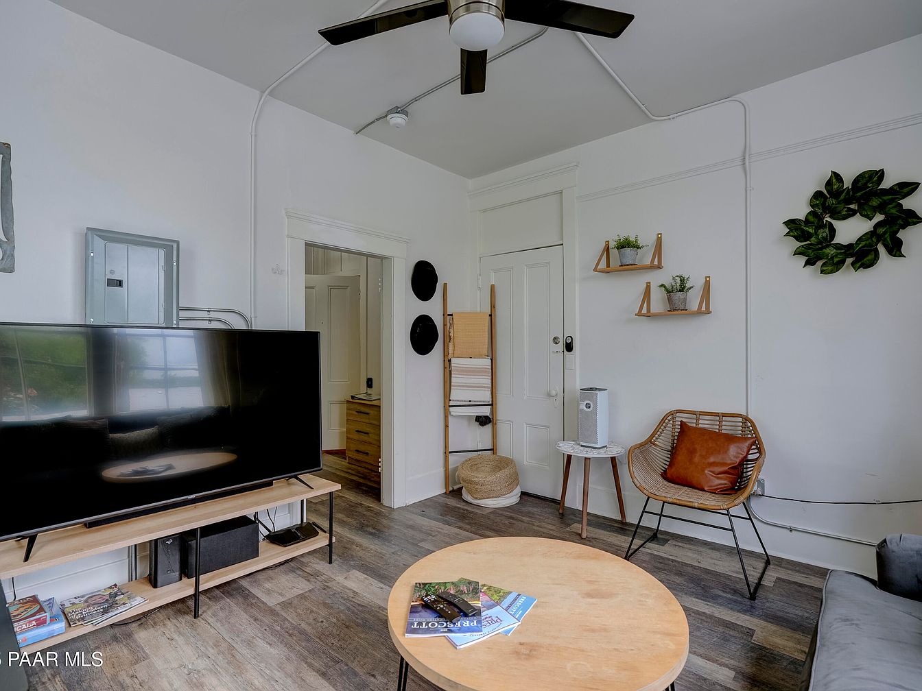 A cozy living room featuring neutral tones with white walls and dark, wood-look vinyl flooring. The space feels contemporary yet welcoming, with a large flat-screen TV on a blond wood stand in the foreground. A round light wood coffee table sits center, topped with colorful magazines. To the right is a rattan chair with a brown leather pillow, placed next to a small side table holding an air purifier. Two small wooden shelves on the wall display potted green plants, while a leafy wreath adds a touch of nature. Black accents are found in the ceiling fan and TV, creating contrast.