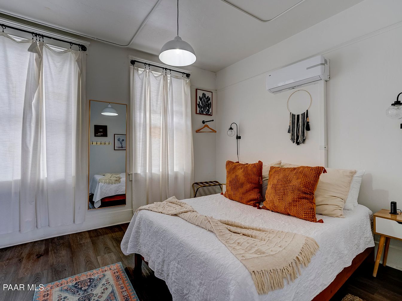 A cozy bedroom featuring a full-size bed made with a textured white coverlet, accented by two large burnt orange throw pillows and a beige throw blanket draped across the foot. The space has a warm, neutral palette with white walls and dark wood flooring. Tall, sheer white curtains cover the windows, allowing soft natural light to filter in. A large mirror on the wall reflects the bed and adds depth to the room. Minimalist wall art and a small macrame wall hanging above the bed add a touch of bohemian charm. A compact nightstand with modern lighting and a small bench complete the functional, inviting space.