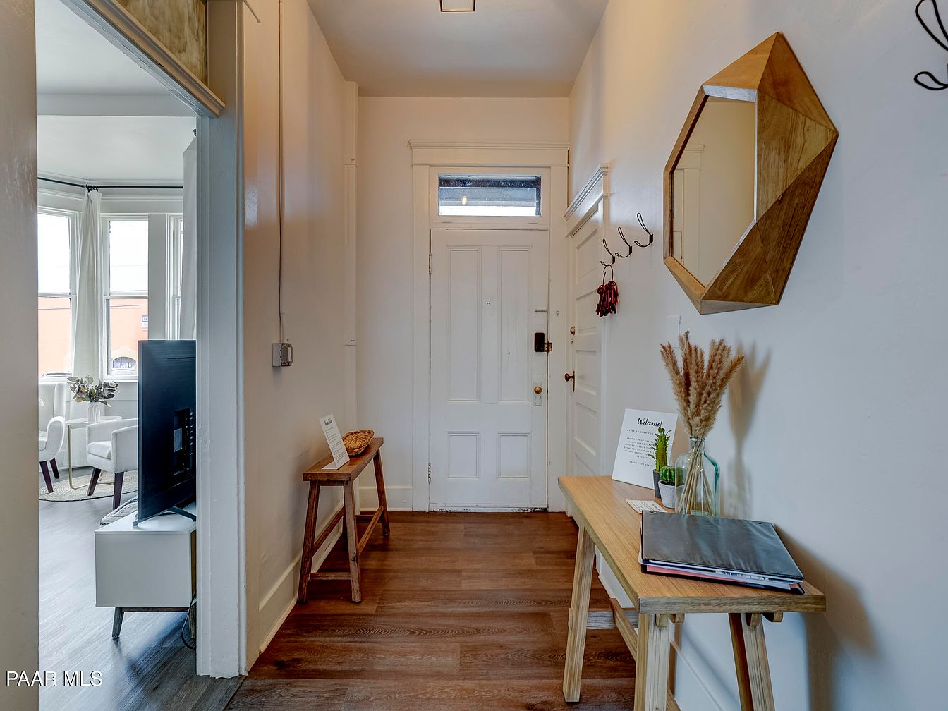 A narrow entryway with a wooden floor and light, neutral walls. Straight ahead is a classic white paneled front door, topped with a rectangular transom window. On the right, a modern geometric wooden-framed mirror accents the wall above a simple wooden console table. The table is decorated with a clear vase filled with dried wheat stalks, a small potted plant, some documents, and a welcome sign. Wall hooks with hanging keys are also present. To the left, an open doorway leads toward a sunlit sitting area with large bay windows, white armchairs, and soft curtains, giving the space a bright, airy feel.
