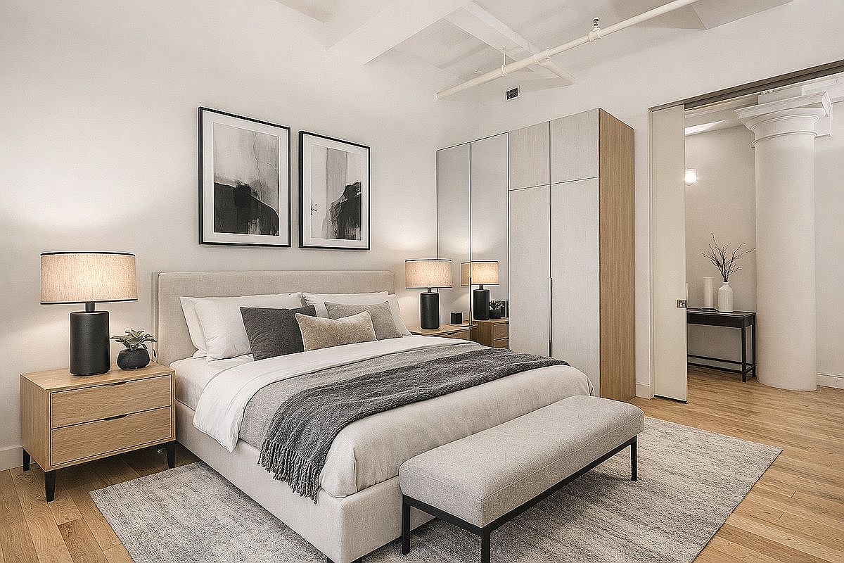 This contemporary bedroom features a soft color palette dominated by whites and greys, creating a serene atmosphere. A plush bed dressed with layered bedding, including a chunky throw, draws the eye. Flanking the bed are two nightstands, each topped with sleek, black table lamps providing warm illumination. Above the bed, abstract black-and-white artwork adds a modern touch. The tall wardrobe combines wood and mirrored panels, reflecting light and enhancing the spacious feel. A minimalist bench at the foot of the bed complements the overall decor, while a subtle area rug ties the space together, blending comfort with style.