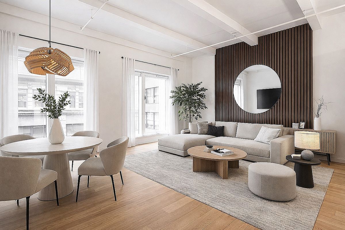 This living room features an open layout with natural light flooding in from large windows. A round dining table with soft chairs complements a cozy seating area, highlighted by a plush sectional couch adorned with neutral cushions. The color palette consists of soft whites and earthy tones, creating a warm atmosphere. A striking wooden accent wall, framed by a large round mirror, adds depth and texture. A light wood coffee table sits at the center, along with smaller side tables. Decorative elements include a stylish pendant light and a potted plant, enhancing the room’s inviting ambiance.