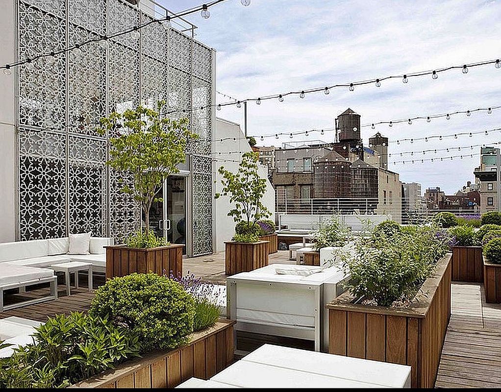 A spacious rooftop terrace features a blend of modern and natural elements. The floor showcases hardwood planks, while sleek white lounge furniture offers comfort and style. Planters made of warm wood contain lush greenery, adding life to the space. Decorative panels with intricate patterns provide a striking backdrop, juxtaposed with city views of various architectural styles. String lights gently illuminate the area, creating a cozy ambiance for evening gatherings. The overall color scheme combines earth tones with soft greens, fostering a serene atmosphere, ideal for relaxation or socializing in an urban setting.