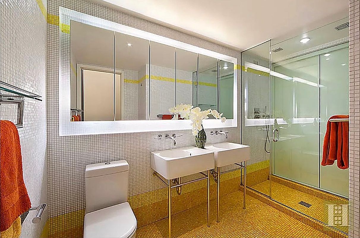 This modern bathroom showcases a sleek, minimalist design with a bright yellow and white color scheme. The mosaic tiles on the walls create a textured backdrop that enhances the spaciousness. A large, illuminated mirror reflects light, adding elegance. Two white rectangular sinks with simple lines sit atop stylish chrome legs, promoting a clean look. The glass shower enclosure maximizes visibility, while a vibrant orange towel adds a pop of color against neutral tones. The floor features radiant yellow tiles, contributing warmth and cheerfulness to the overall aesthetic. A delicate vase with white flowers introduces a touch of nature.