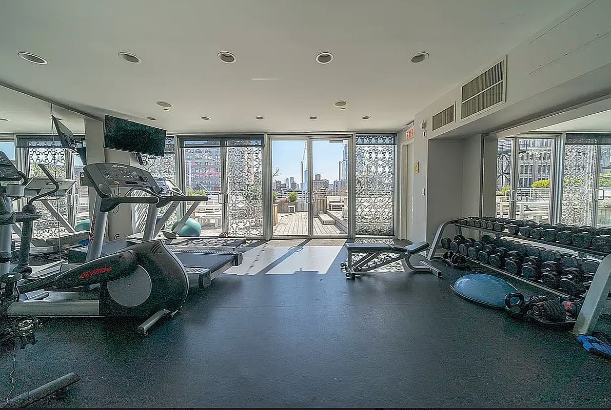 The space showcases a modern home gym, characterized by sleek, minimalistic design elements. It features a dark rubber floor that enhances resilience and comfort. A treadmill and elliptical machine are positioned strategically, complemented by a wall-mounted television for entertainment. Large glass doors offer ample natural light, leading to an outdoor deck, while decorative etched glass panels provide visual interest without sacrificing privacy. A dumbbell rack is neatly organized against the wall, showcasing an array of weights. The color palette is predominantly neutral with touches of metallic accents, promoting a clean and focused atmosphere suitable for workouts.