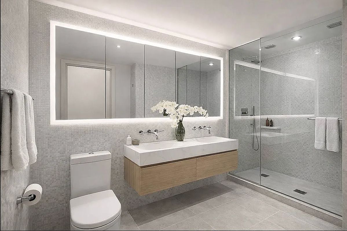 A modern bathroom featuring sleek design elements and a calming color scheme. The walls and floor are clad in light gray tiles, creating a unified and spacious feel. A floating vanity with dual sinks showcases a white countertop contrasting with warm wooden cabinetry beneath. Above, an expansive backlit mirror amplifies light, enhancing the room’s brightness. Glass shower doors lead to a minimalist shower area with seamless tilework. Textured towels hang neatly beside the vanity, while a vase with delicate white flowers adds a touch of elegance. This space embodies contemporary sophistication and tranquility.
