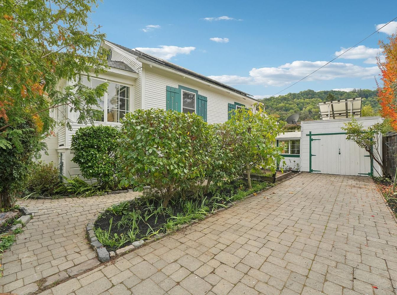 A picturesque driveway laid with beige cobblestones leads toward a detached garage with a classic white wooden door trimmed with green. Alongside the drive, neatly pruned shrubs and lush green foliage line the walkway, providing a soft verdant border and a sense of privacy. The house exterior features traditional white siding and green shutters on the windows, evoking a charming and historic ambiance. Mature landscaping surrounds the area, with pops of autumn color from nearby trees, and rolling green hills create a scenic backdrop under a bright blue sky with fluffy clouds.