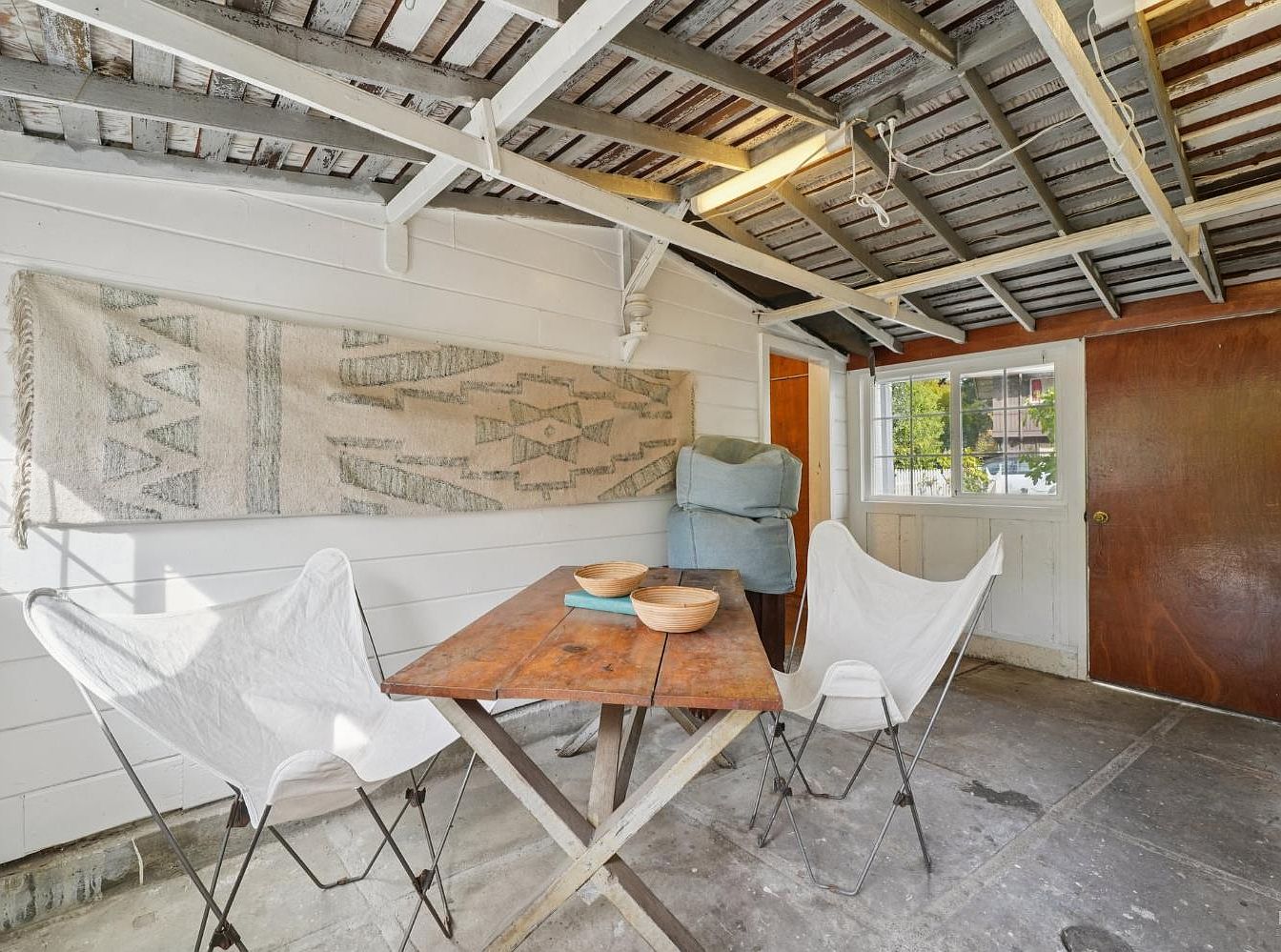 A cozy porch space set under a rustic, exposed-beam ceiling painted in white and grey tones. The floor appears unfinished, with weathered cement adding to the relaxed atmosphere. A simple wooden dining table with X-shaped legs sits at the center, flanked by two modern butterfly chairs draped in white fabric. On the table, two wooden bowls and a teal napkin add subtle color. A large, neutral-toned woven textile with geometric patterns hangs on the wall, complementing the white horizontal wood paneling. Natural light streams in from a multi-pane window and door, providing views of the greenery outside.
