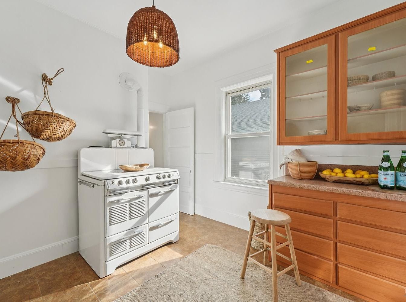 A bright, vintage-inspired kitchen with a focus on warmth and simplicity. The centerpiece is a classic white enamel stove with chrome details, positioned below a pair of woven baskets that hang on the wall. Adjacent to it, natural wood cabinetry and a matching countertop hold lemons in a wooden tray and glass bottles of mineral water, with additional storage space visible behind glass-front cabinets. A woven pendant light hangs above, adding texture and a warm glow. The walls and trim are crisp white, creating a clean backdrop, while a neutral rug and a wooden stool complete the look, emphasizing rustic charm and historic character.