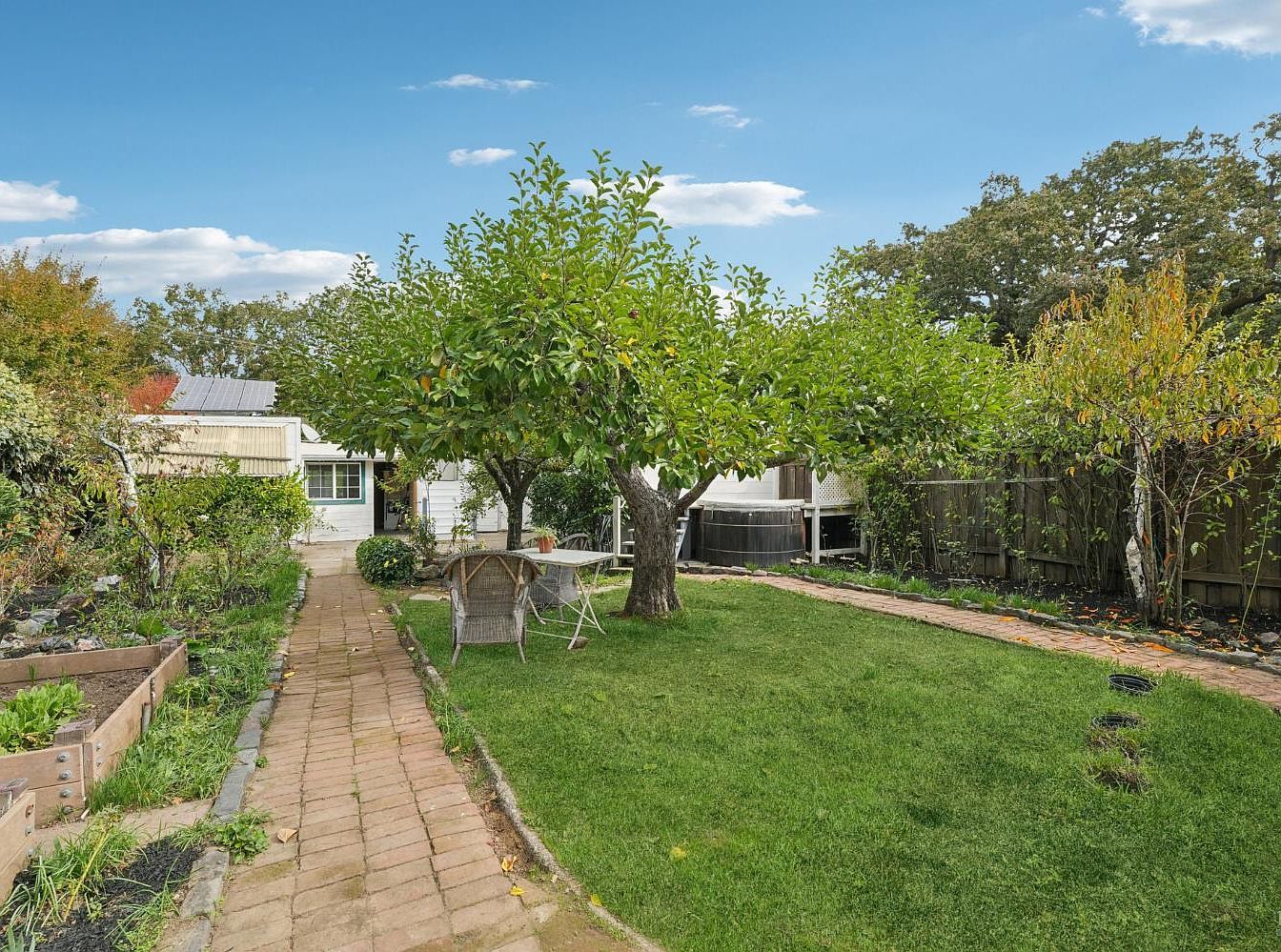 A spacious yard features a central lawn bordered with brick pathways, creating a defined walking space throughout. To the left, raised garden beds brim with green plants and herbs, suggesting a mix of flowers and vegetables. At the center, two leafy fruit trees provide dappled shade over a small outdoor table and chairs, inviting relaxation or casual dining. The perimeter of the yard is lined with wooden fencing and additional plantings, providing privacy and a lush, established feel. The rear of the property includes a white outbuilding, blending well with the verdant landscape and cottage-like ambiance.