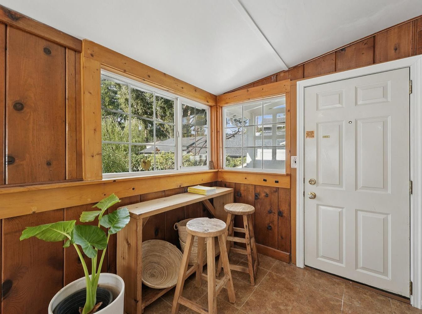 A cozy entryway corner with knotty pine wood-paneled walls and a white paneled door. The space is sunlit by two large windows that allow natural light to flood the area, offering a clear view of greenery outside. A narrow wooden console table runs beneath the windows, paired with rustic wooden stools for casual seating. The floor is finished in warm-tone tile, complementing the wood walls. A potted plant with glossy green leaves adds a touch of freshness and color, while simple baskets and books give the area a welcoming, lived-in feel. The overall aesthetic is warm, rustic, and inviting.