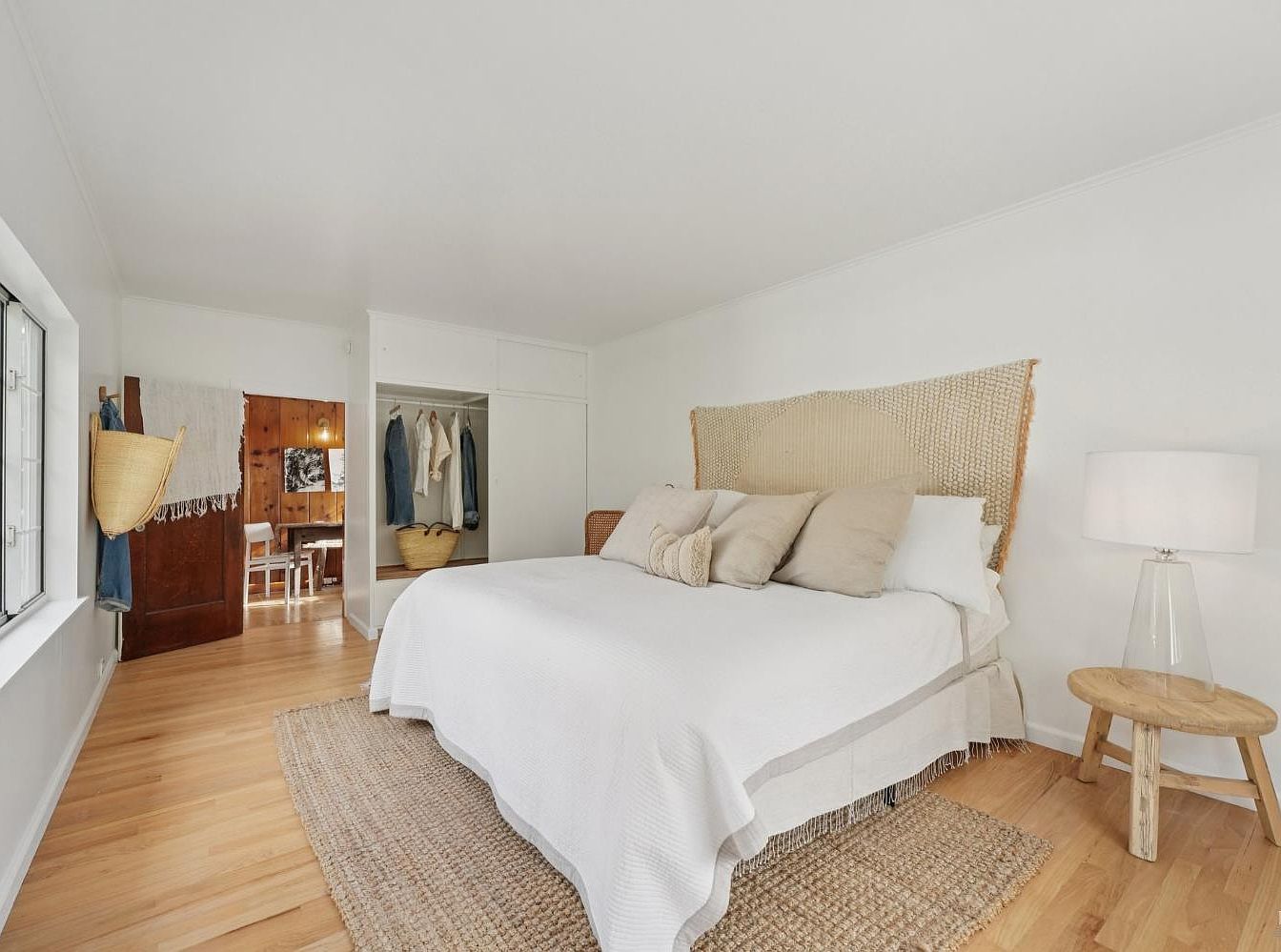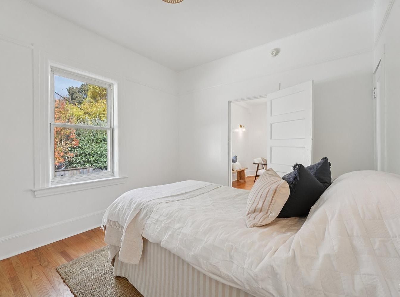 A serene bedroom featuring a bed with a white quilt and a mix of cream and navy accent pillows is centered on a warm wood floor. An earth-toned woven rug rests beneath the bed, adding texture to the minimalist space. The walls and trim are painted bright white, enhancing the light that streams in from a large window overlooking trees in autumn colors. Across the room, an open paneled door leads to another area with a bench and chair, both topped by accent pillows. The overall look is clean, airy, and uncluttered, evoking calm and simplicity.