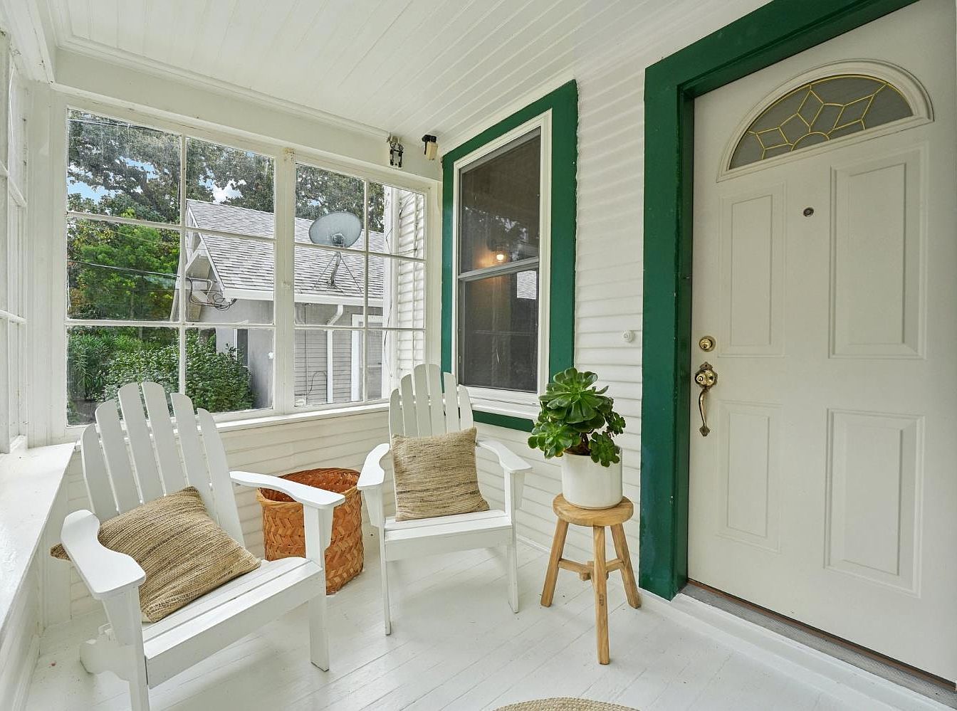 This space features a charming front porch with two Adirondack-style wooden chairs painted white, each adorned with a tan woven pillow for comfort. The area is bathed in natural light from large windows that frame views of trees and an outbuilding. The walls, ceiling, floor, and even window sills are all painted a bright, clean white. Green trim adds a striking accent around the windows and door, highlighting classic architectural lines. A small round wooden stool holds a leafy potted plant, introducing a touch of greenery. A wicker basket adds additional rustic texture, contributing to a cozy, welcoming feel.