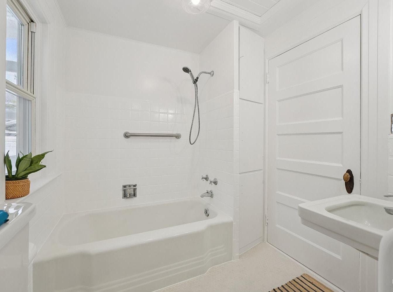 A bright and clean bathroom featuring a classic white bathtub with a mounted showerhead and a silver grab bar above the tub. The walls are covered with glossy white tiles, contributing to an overall fresh and airy feeling. A window to the left brings in natural light, adorned with a small potted plant on the sill for a touch of greenery. A simple striped rug lies on the light-colored floor, while a paneled white door with an antique-style knob provides access. The room maintains a minimalistic, functional, and timeless aesthetic with its all-white palette and subtle accents.