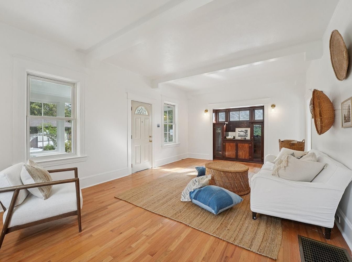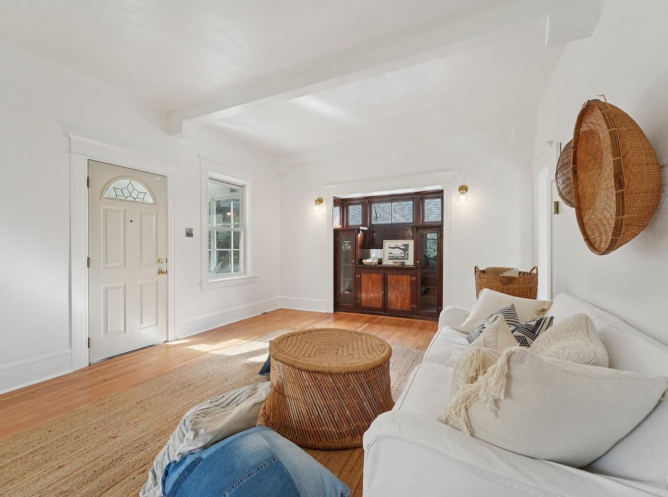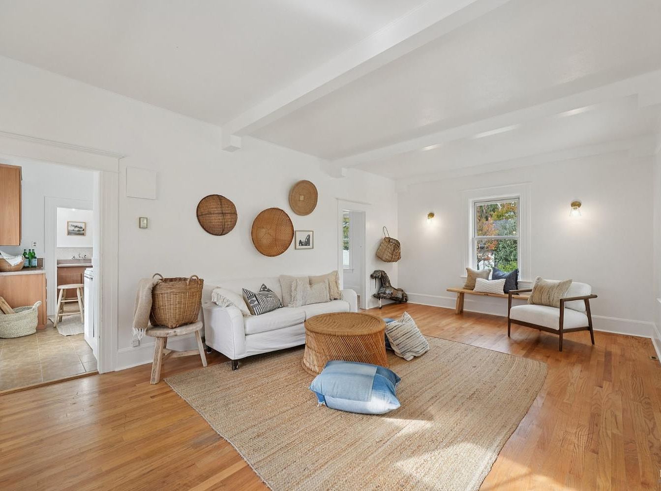 Bright and airy space with crisp white walls and ceiling beams, balanced by warm hardwood floors. The area centers on a natural jute rug with a round wicker coffee table and blue floor pillows, creating a relaxed seating spot. A white sofa with neutral throw pillows sits across from a modern wooden accent chair. The front door and tall double windows bring in abundant daylight, and woven baskets hang decoratively on the walls for added texture. At the far end, a vintage wood built-in cabinet with glass panes and brass sconces adds historic charm and elegance to the room.