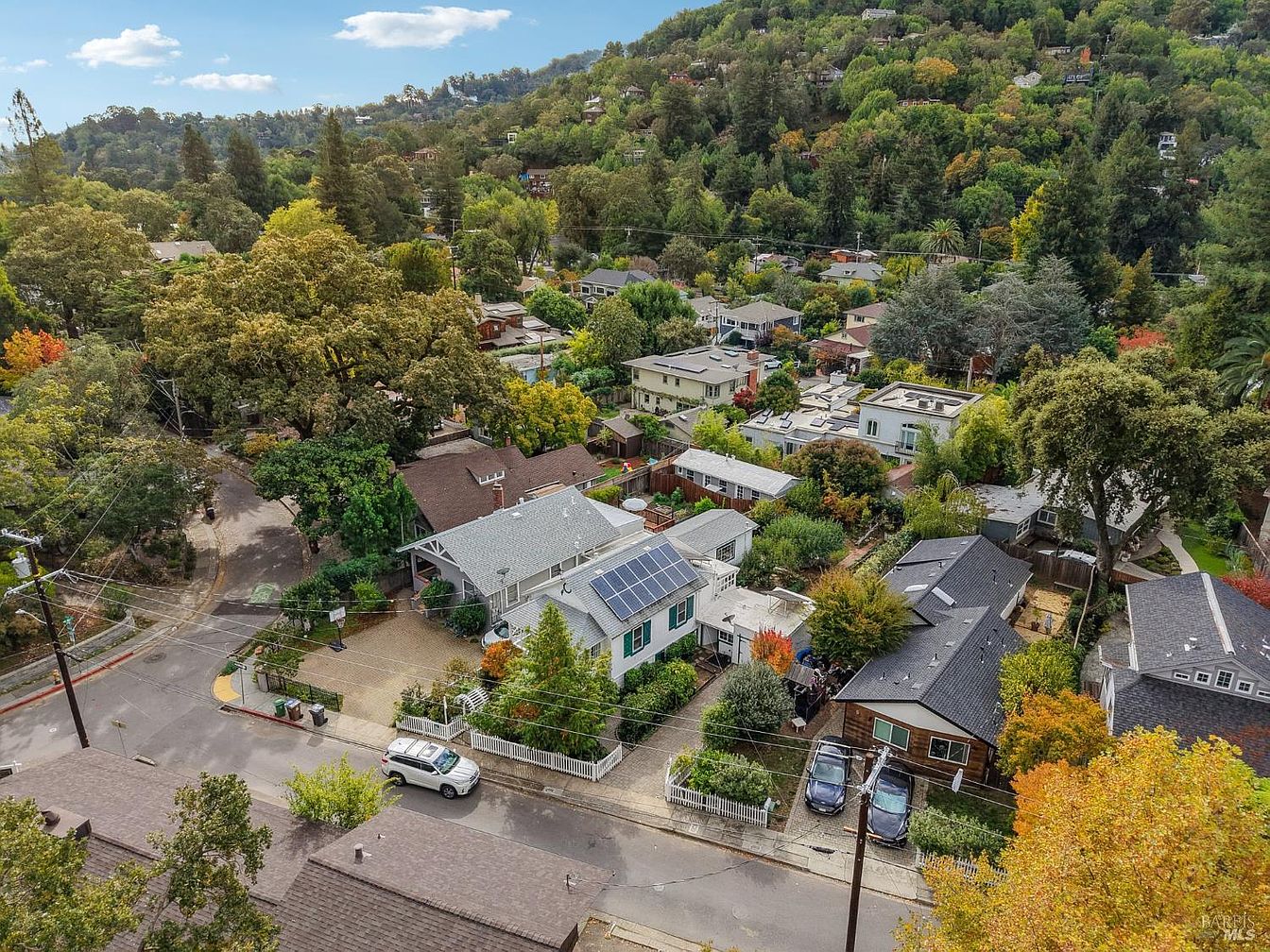 Aerial view of a charming historic American home situated on a quiet corner lot surrounded by mature trees and lush landscaping. The house features a white exterior, a gray gabled roof with solar panels, and green-trimmed windows. A white picket fence encloses the front yard, which is filled with vibrant shrubs and greenery. The driveway leads to a neatly landscaped entrance beside the house. Neighboring homes have diverse architecture and roofing, all set against a densely forested hillside that provides a sense of privacy and natural beauty. The overall scene radiates tranquility and classic suburban aesthetics.