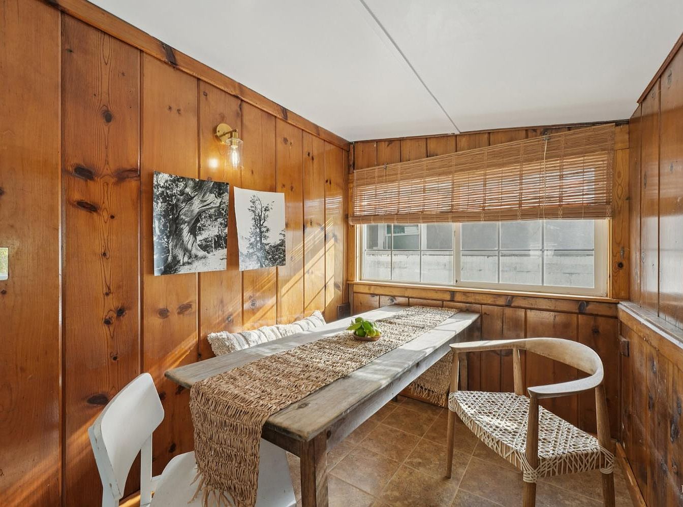 A cozy breakfast nook displaying vintage charm with knotty pine wood paneled walls and warm, rich wood tones throughout. The rustic wooden table features a woven natural fiber runner, paired with a modern white chair and a woven-back wooden chair, enhancing a blend of old and new styles. The bench seating along the wall is topped with textured cushions, creating a comfortable space. Large windows with bamboo shades allow natural light to pour in, softening the space. Two black-and-white photographs of trees hang on the wall, adding an artistic yet organic element to the atmosphere.