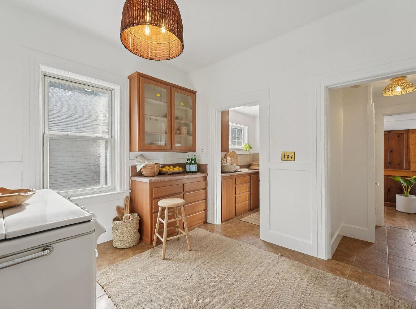 A bright kitchen area features warm wooden cabinetry with glass-fronted upper cabinets, housing neutral dishes and minimal decor. The countertops are simple and functional, with a bowl of lemons and a wicker basket adding a fresh, organic touch. A woven rug softens the tiled floor and a light wooden stool sits ready for use. Natural light pours in through two large windows, giving the space an airy feel. Architectural details include crisp white walls with subtle molding, classic doorways leading to an adjacent pantry and a wood-paneled room, and a woven pendant light that adds warmth and texture overhead.